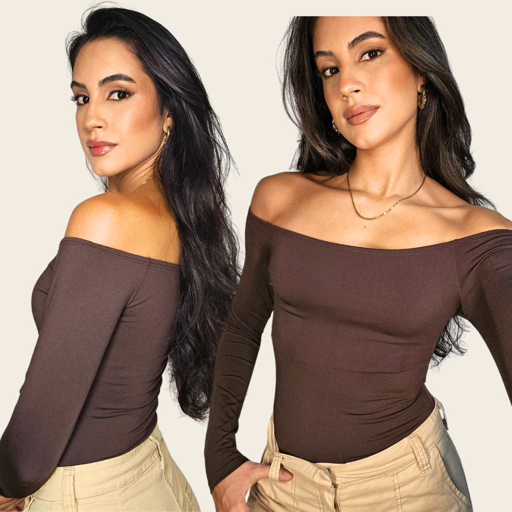 Body Manga Longa Ombro a Ombro Feminino Moda Gringa Suplex Y2K Bory Ciganinha Modelador Premium Marrom Preto Cinza