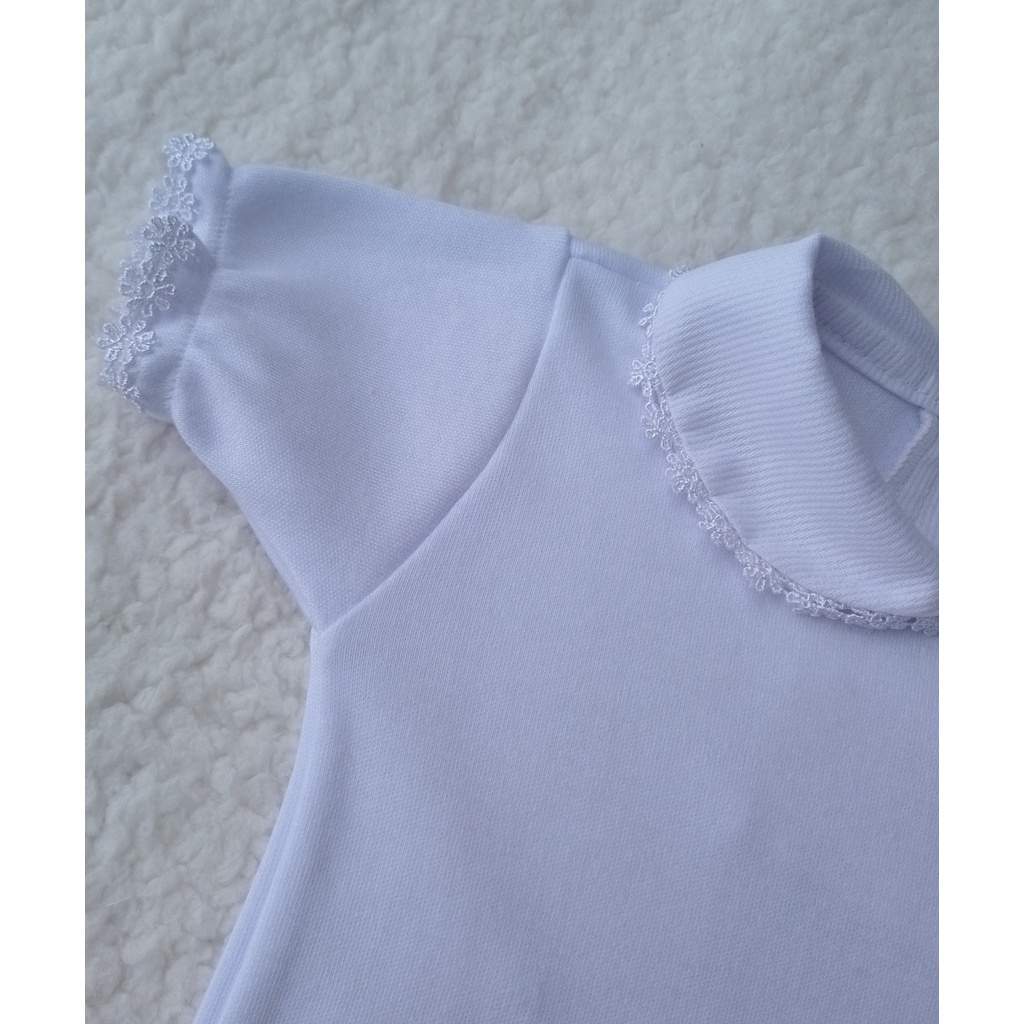 Body menina manga curta 100% algodão, com gola redonda e com renda guipir