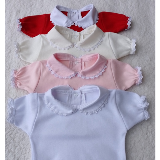 Body menina manga curta 100% algodão na malha suedine com um toque macio, com gola e punhos no tecidos fustão 100% algodão ,no seu acabamento com renda guipir Nas cores : BRANCA ROSA OFF VERMELHA Medidas e tamanhos : P 36cm comprimento, 23cm largura (para bebês de 0 a 3 meses) M 38cm comprimento,24cm largura (para bebês 3 a 6 meses) G 40cm comprimento,25cm largura (para bebês 6 a 9 meses) GG 42cm comprimento,27cm largura (para bebês 9 a 12 meses) OBSERVAÇÃO: Os tamanhos pode variar de acordo com o tamanho do bebê.