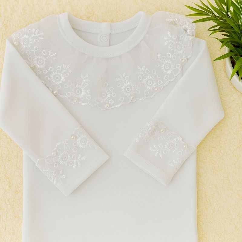 Body menina manga longa com detalhes na gola e punho em renda e aplicações em pérolas, Cor Branco.