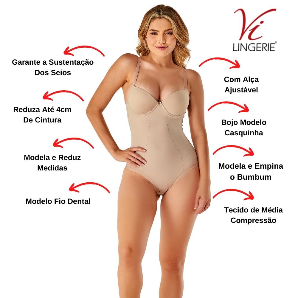 Body Modelador E Redutor Alto Compressao Fio Dental Vi Lingerie - Original Body confeccionado em cetinete power compressivo, leve, macio e super confortavel.. Com aro e bojo moldado que acomoda, modela e realca os seios na medida ideal. Decote acentuado com acabamento que nao marca sob a roupa, adornado por laco em cetim, acrescenta charme a peca. Possui reforco estrategico em tecido duplo na parte frontal. Comprime o abdomen, modela a cintura e corrige a postura. Costas com decote reto. Cavas das pernas com acabamento em elastico suave. Sem abertura no entrepernas. Alcas largas regulaveis. Fundo em algodao. - Modela as formas. - Disfarca as imperfeicoes. - Tecido com toque firme e sedoso, comprime com seguranca e conforto. - Reducao de ate 3,5 cm nas medidas. Tamanhos: 40 - 42 - 44 - 46 - 48 Composicao: Poliamida: 79% Elastano: 21% Forro: Algodao: 100% Forro do bojo: Poliester: 40% Poliuretano: 60%