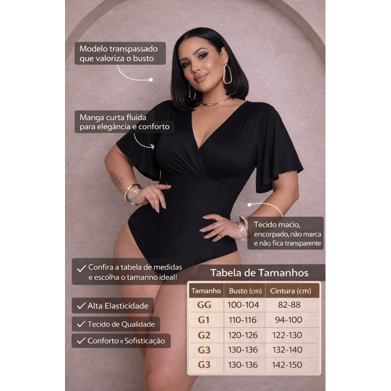 Realce sua beleza com o Body Plus Size Manga Morcego, desenvolvido para oferecer conforto, estilo e caimento impecável. O modelo possui decote transpassado, que valoriza o colo, e mangas estilo morcego, trazendo leveza e elegância ao visual. Confeccionado em tecido macio, que se ajusta ao corpo sem marcar, garantindo mobilidade, sustentação e muito charme para qualquer ocasião. Ideal para usar com saias, calças ou shorts — perfeito para compor looks do dia a dia até produções mais sofisticadas.