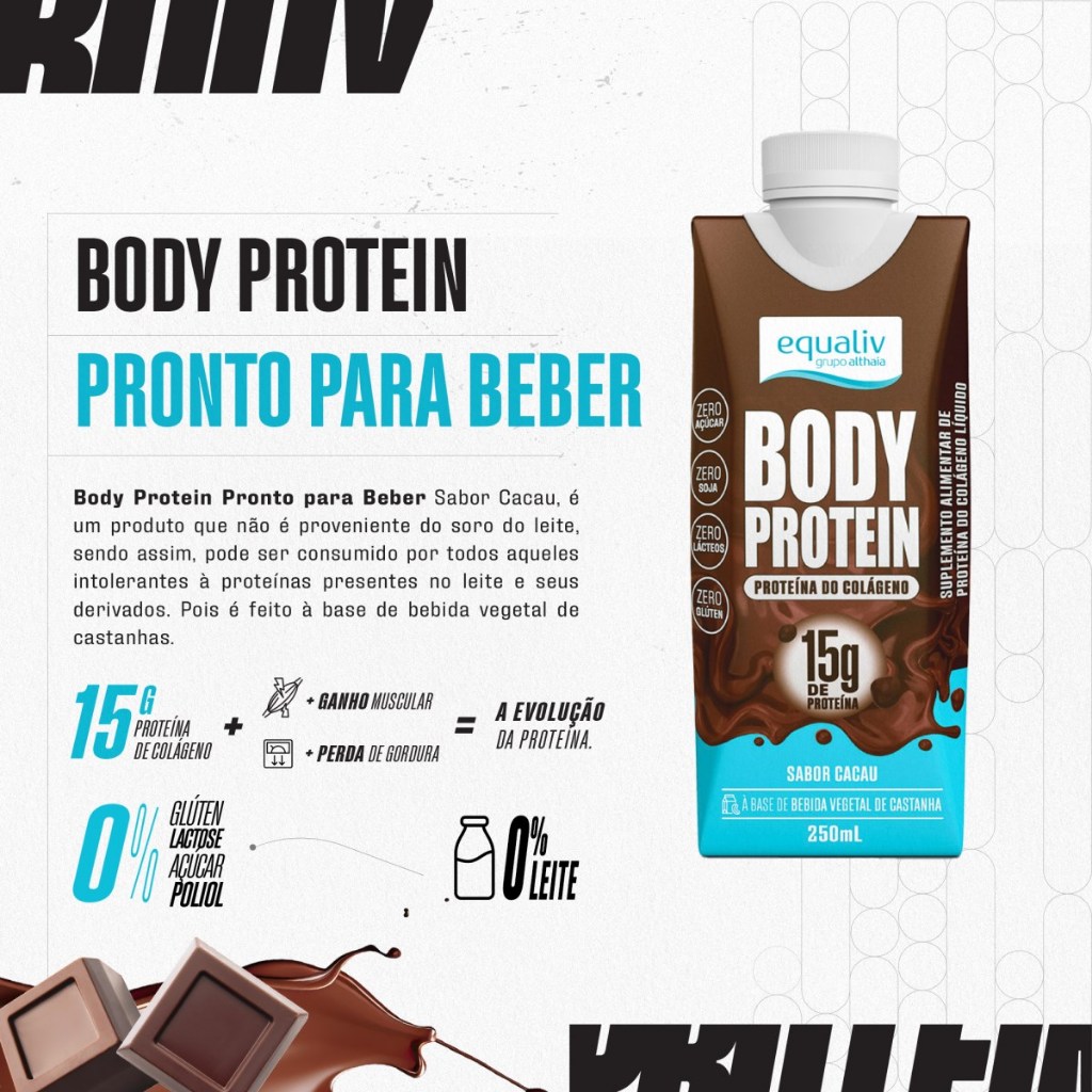 Kit Composto Por: Body Protein Cacau – Pronto para beber 250ml (24 unidades) Não exceder a recomendação diária de consumo indicada na embalagem. Este produto não é um medicamento. Mantenha fora do alcance de crianças. Uso adulto. Alérgicos: Contém castanha de caju e pode conter amêndoas. Conservar em local seco e arejado. Após aberto, consumir imediatamente.