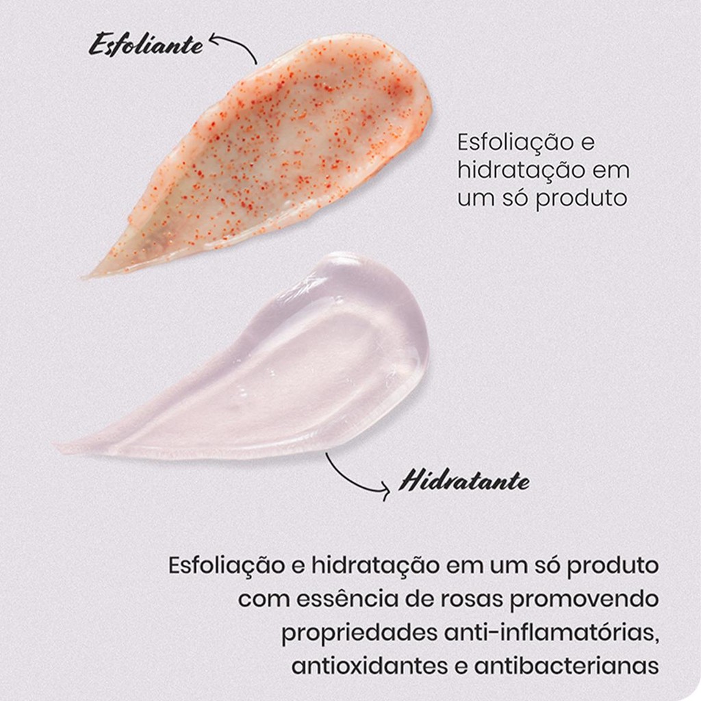 Body Scrub 2 em 1 Esfoliante e Gel Hidratante Corporal - Koasis: em um só passo para uma pele renovada O Esfoliante Corporal 2 em 1 foi desenvolvido para transformar a rotina de cuidados com a pele em um momento prático e eficaz. Com sua fórmula inovadora, combina esfoliante e gel hidratante na mesma embalagem, promovendo a remoção das células mortas enquanto hidrata profundamente. Assim, revela uma pele mais macia, luminosa e uniforme em poucos minutos. Graças à sua ação suave, o esfoliante remove impurezas e resíduos acumulados, renovando a textura da pele sem agredir. Ao mesmo tempo, o gel hidratante refrescante devolve a umidade essencial, garantindo nutrição e conforto imediato. Essa fusão entre esfoliação e hidratação torna o produto ideal para quem busca praticidade sem abrir mão de resultados visíveis no cuidado diário. Fácil de usar, basta pressionar o centro da embalagem para liberar as duas fórmulas ao mesmo tempo. A aplicação deixa uma sensação de frescor, enquanto o uso regular, de 1 a 2 vezes por semana, promove uma pele sempre renovada, suave e radiante. O Esfoliante Corporal 2 em 1 é a solução perfeita para quem deseja aliar eficiência, praticidade e cuidado completo em um único produto. Especificações Marca: Koasis Conteúdo: 210ml Modelo: Body Scrub 2 em 1 – Esfoliante e Gel Hidratante Função: Esfoliar, hidratar e renovar a pele Benefícios: Textura uniforme, frescor imediato, hidratação intensa Indicação: Todos os tipos de pele Produto Hipoalergênico e Vegano Produto com certificação da Anvisa Modo de uso: Aplicar sobre o corpo 1 a 2 vezes por semana, pressionando o meio do frasco para liberar as duas fórmulas ao mesmo tempo Precauções: Manter em local seco e longe da luz solar; suspender uso em caso de irritação. Composição: Água, butileno glicol, carbomer, diazolidinil ureia, betaine, extrato de aloe vera, hidróxido de sódio, pantenol, hialuronato de sódio, extrato de flor de rosa rugosa, perfume, corantes, citronenol, geraniol.