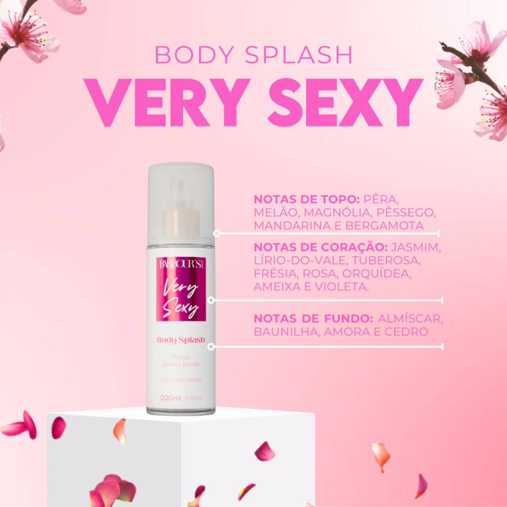 Body Splash Very Sexy – Barbours Beauty | 200ml Uma fragrância feita para brilhar. Very Sexy mistura frescor, doçura e elegância, criando uma aura sedutora e irresistível. Destaques: Notas de pêra, jasmim e baunilha que encantam desde o primeiro spray Aroma sensual e sofisticado, perfeito para encontros ou para se destacar no dia a dia Fórmula leve e duradoura, com um toque de almíscar e cedro Pirâmide Olfativa (resumo) Topo: Pêra, melão, mandarina Coração: Jasmim Fundo: Baunilha, almíscar, cedro