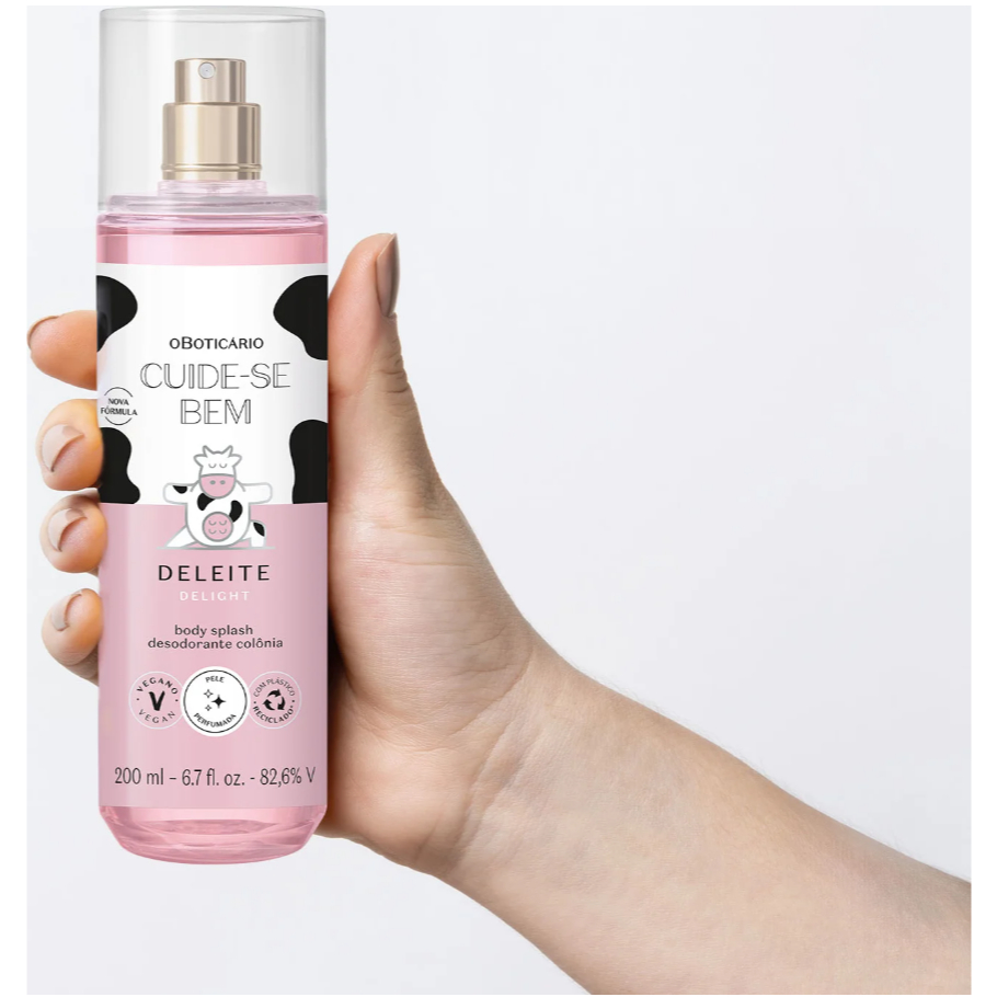 Body Splash Cuide-Se Bem Deleite 200ml O Body Splash Cuide-Se Bem Deleite traz uma fragrância leve e suave que prolonga o cheirinho da sua loção corporal preferida e a sensação de frescor pós banho. -Com nova fórmula; -Pele perfumada; -Cheirinho doce e envolvente. Segredinhos de sustentabilidade: Sua embalagem é feita com PET reciclado e sua fórmula contém 91,7% ingredientes naturais, para você se deliciar nessa fragrância vegana que faz bem à natureza! Ideal para o dia a dia, este body splash vai envolver sua pele com uma fragrância suave e delicada, deixando uma sensação refrescante e hidratada o dia todo. SOBRE A LINHA A linha Cuide-se Deleite vai além do básico para trazer leveza à rotina. Com fragrância inspirada no conforto e no cheiro do leite, promove a hidratação que você precisa com ativos que cuidam da pele e cabelos em diferentes ocasiões de uso. Encante-se com os resultados da linha Cuide-se Bem! Nenhum produto do Boticário é testado em animais, ou seja, este item possui selo Cruelty Free.