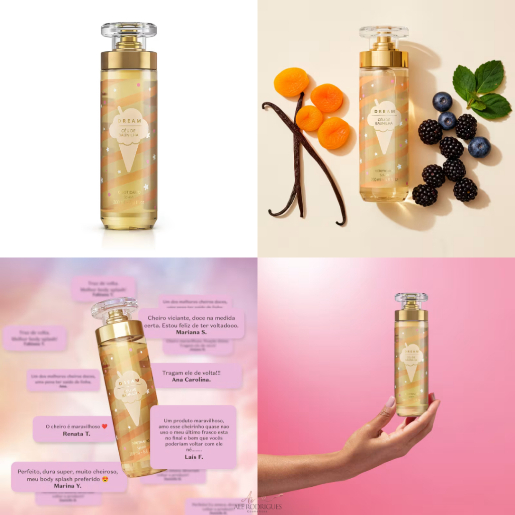 Body Splash O Boticário DREAM Viagem Encantada Ceu de Baunilha e Amor no Ar Se você é um verdadeiro BotiLover, sabe que alguns produtos deixam saudade, mas nunca saem das nossas conversas. E por muito tempo, um pedido em comum dominou as redes sociais: a volta dos Body Splashes Dream. A boa notícia é que a espera finalmente acabou e a linha está novamente entre nós. Agora, você tem a chance de garantir o seu queridinho de novo ou então, descobrir por que essas fragrâncias são tão amadas. Prepare o coração e venha conferir todos os detalhes dessas fragrâncias que vão transformar a sua rotina de cuidados em um verdadeiro sonho! Agora que você já sabe que esses clássicos voltaram a pedido do público, confira os detalhes de cada um dos Body Splashes que convidam a tirar a rotina do sério: Dream Viagem Encantada Uma verdadeira carona no arco-íris! O Dream Viagem Encantada é para quem ama fragrâncias doces e divertidas. Com notas de Pêra Caramelizada e o toque irresistível do Suspiro, ele transforma qualquer dia cinza em uma explosão de cores e alegria. É o Floral Gourmand ideal para quem quer se sentir leve o dia todo. Pirâmide Olfativa Topo: era, Limão, Cassis Corpo: Jasmim, Açúcar Mascavo, Muguet Fundo: Cedro, Musgo de Carvalho, Musk Dream Céu de Baunilha A vida fica muito mais doce quando a gente imagina. O Dream Céu de Baunilha traz aquela fragrância gourmand que abraça, misturando o frescor do limão e da pimenta rosa com a cremosidade do Damasco e das Frutas Roxas. É como mergulhar em uma nuvem de conforto e indulgência. Pirâmide Olfativa Topo: Frutas Roxas, Limão, Pimenta Rosa e Frutas Secas. Corpo: Cashmere, Flor Solar, Damasco. Fundo: Âmbar, Musk Branco, Warn Milk, Maltol e Baunilha. Dream Amor No Ar Delicado e romântico, o Dream Amor No Ar é para os sonhadores de plantão. Sua fragrância Floral Amadeirada combina o frescor da Bergamota e do Cassis com um buquê clássico de Rosa e Flor de Lótus. É o item ideal para momentos em que você quer se sentir feminina e envolta em uma aura de encanto. Pirâmide Olfativa Topo: Bergamota, Laranja, Mandarina, Limão, Cassis e Maçã. Corpo: Rosa, Tília, Frésia, Flor de Lótus, Ameixa, Gardênia e Pêssego Fundo: Âmbar, Sândalo, Baunilha, Tonka e Musk. #CombinaçõesDoBoti: Descubra o layering e crie combinações incríveis com Dream! Viagem Encantada + Amor No Ar: Floral intenso & Dulçor confortável - Combinação que exalta maior presença de floralidade cremosa e frescor frutal. Céu De Baunilha + Amor No Ar: Floral intenso & Dulçor confortável - Combinação que exalta maior presença de floralidade cremosa e frescor frutal. Dream Amor no Ar, para acreditar que a vida pode ser cor de rosa sem precisar de príncipe encantado ou sapatinho de cristal! Nenhum produto O Boticário é testado em animais, ou seja, este item possui o selo Cruelty Free. Conselho de Aplicação Como usar o body splash? Borrife a fragrância nas áreas onde há maior circulação do sangue, como o pescoço, dobras do cotovelo e atrás das orelhas. Para aumentar o potencial da perfumação, experimente preparar a pele com os nossos produtos de Corpo e Banho. Escolha seu DREAM preferido ou leve os 3 para casa! Opções: 01. DREAM Viagem Encantada 200ml 02. DREAM Céu de Baunilha 200ml 03. DREAM Amor no Ar 200ml 04. Combo 3 DREAM 200ml