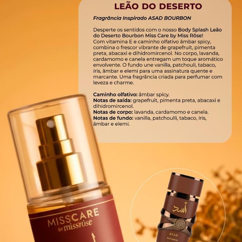 Leão do Deserto Bourbon Body Splash Masculino | Miss Care by Miss RôseInsp. no Asad Bourbon, esse body splash masculino entrega uma fragrância âmbar spicy intensa, elegante e marcante. Enriquecido com vitamina E, perfuma a pele com conforto e frescor, ideal para o dia a dia ou para ocasiões especiais. *Notas de saída: grapefruit, pimenta preta, abacaxi e dihidromircenol — abertura vibrante, fresca e impactante. *Notas de fundo: vanilla, patchouli, íris, âmbar e elemi — quentes, sensuais e envolventes, que fixam na pele e deixam rastro por onde você passa. Uma fragrância feita para o homem confiante, que gosta de chegar chegando, chamar atenção pelo cheiro e ser lembrado.