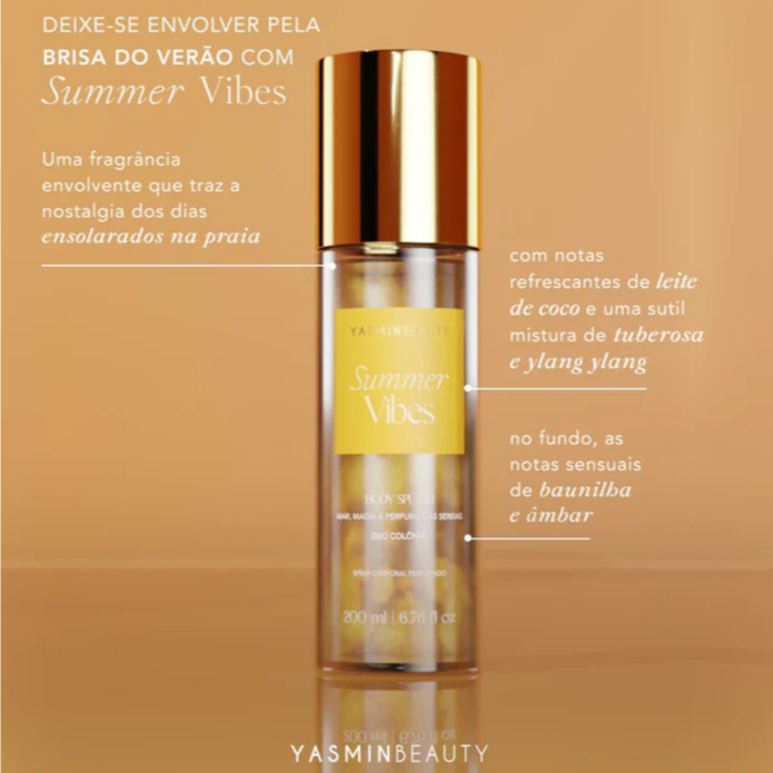 O Body Splash Summer Vibes 200ml – Yasmin Beauty é a fragrância feminino perfeita para quem ama dias ensolarados e pele perfumada o dia todo. Um body splash corporal envolvente que traduz liberdade, calor e energia do verão. Com notas de leite de coco, tuberosa e ylang ylang, finalizadas com baunilha e âmbar, esse splash 200ml entrega frescor com toque sensual. Funciona como desodorante colônia leve, ideal para pós-banho, rotina diária ou para reaplicar sempre que quiser renovar a sensação de bem-estar. Mais suave que um perfume, mas com fixação alta para a categoria de body splash, ele deixa a pele delicadamente perfumada e radiante. Perfeito para usar sozinho ou montar kit com 2 ou 3 fragrâncias da linha Beauty e criar sua combinação favorita. Sinta sua energia, seu lado sensual no verão com o Body Splash Summer Vibes Yasmin Beauty.