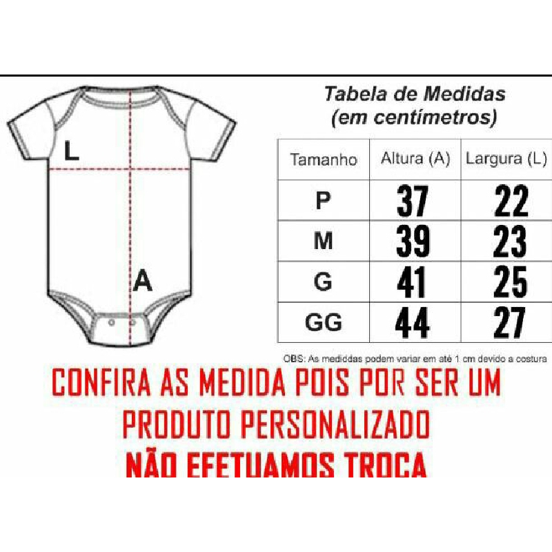 NÃO PERSONALIZAMOS. 1- O PEDIDO É ENVIADO CONFORME IMAGEM DO ANÚNCIO. 2- CASO QUEIRA SOLICITAR OUTRO NOME ENVIAR POR CHAT QUE ENVIAREMOS O LINK COM O NOME DESEJADO. 3- SÓ EFETUAR A COMPRA DO NOME QUE REALMENTE DESEJA. 4- SÓ ESTAMPAMOS NO BODY BRANCO. 5- O PRAZO PARA ENVIO É DE ATÉ 2 DIAS ÚTEIS. (NORMALMENTE ENVIAMOS PEDIDOS DE SEGUNDA A SEXTA) 6- A ENTREGA E COLETADA E FEITA PELA TRANSPORTADORA DA SHOPEE. 7- EM CASO DE CANCELAMENTO E REEBOLSO O O ESTORNO É FEITO AUTOMATICAMENTE PELO SISTEMA DA SHOPEE NÃO TEMOS ACESSO E NÃO CONSEGUIMOS EFETUAR DEVOLUÇÃO DE VALORES. TAMANHOS: - P veste de 0 à 3 meses Medidas20cm de Largura e 34cm de Altura, - M veste de 4 à 6 meses Medidas 22cm de Largura e 36cm de Altura - G veste de 7 à 9 meses Medidas 23cm de Largura e 38cm de Altura. - GG veste de 10 à 12 meses Medidas 24cm de Largura e 42 cm de Altura Podendo variar até 1cm, por causa da costura. Informações técnicas : -Material: malha 100% poliéster