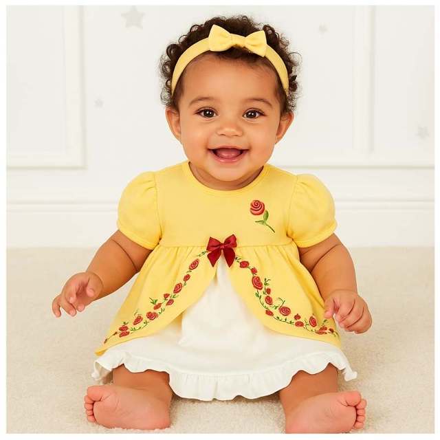 Body vestido bebê fantasia manga curta amarelo bordado princesa bela e a fera com faixa de cabelo