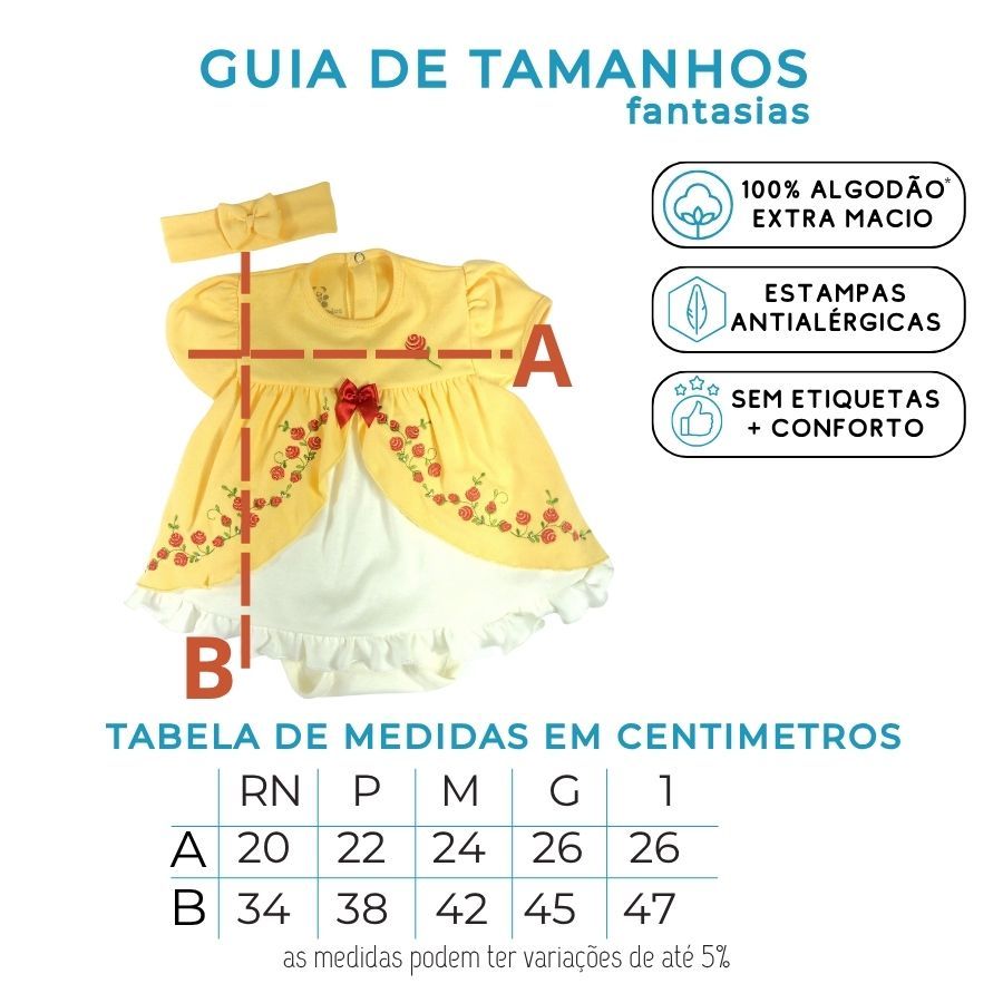 | Body vestido bebê fantasia manga curta amarelo bordado princesa bel... este produto | R$ 61,99 | — | 4.8/5 | 6 |
