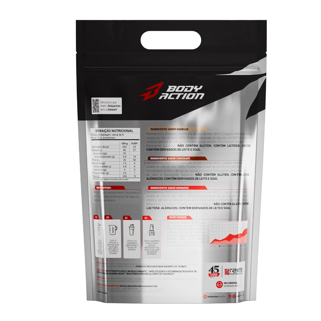 Body Whey Refil - O Blend Premium para Seus Resultados Whey Protein Concentrado, Isolado e Hidrolisado - 30g de Proteína por dose O consumo de proteína é primordial para quem busca o ganho de massa muscular ou somente a sua manutenção. No entanto, o mais importante é escolher uma fonte de proteína de alta qualidade, que combine rápida absorção, um perfil completo de aminoácidos, vitaminas e minerais. Pensando nesses consumidores, a Body Action traz ao mercado o Body Whey Refil, uma fórmula avançada que oferece um ALTO VALOR BIOLÓGICO. Este produto é um blend estratégico, composto por: Proteína Concentrada do Soro do Leite (WPC) Proteína Isolada do Soro do Leite (WPI) Proteína Hidrolisada (WPH) Essa combinação garante a liberação gradual e eficiente de nutrientes, otimizando a absorção pelo organismo. QUAIS SÃO OS BENEFÍCIOS DO BODY WHEY DA BODY ACTION? GANHO DE MASSA MUSCULAR EFICAZ EVITA O CATABOLISMO (perda de músculo) RECUPERAÇÃO MUSCULAR ACELERADA MAIS ENERGIA E DISPOSIÇÃO COMO E QUANDO CONSUMIR O BODY WHEY DA BODY ACTION? Misture 120g (três dosadores) em 300ml de água, de preferência gelada para melhor absorção. Consumir 1 (uma) vez ao dia ou conforme orientação de nutricionista ou médico. TABELA NUTRICIONAL: (Inserir a tabela completa aqui) QUAIS CUIDADOS TOMAR? Mantenha fora do alcance de crianças. Este Produto não é um medicamento. Este produto é indicado para maiores de 19 anos. Este produto não deve ser consumido por gestantes, lactantes e crianças. Não exceder a recomendação diária de consumo indicada na embalagem. COMO FAÇO PARA CONSERVÁ-LO? Manter em local fresco, não úmido e ao abrigo de luz. Não consumir o produto caso o lacre de proteção estiver violado. QUAL SUA COMPOSIÇÃO? Baunilha: Maltodextrina, Proteína Concentrada de Soro do Leite (WPC), Tetra-Build (Glicina, L-Treonina, Taurina e Biotina (D-Biotina)) Colágeno Hidrolisado, Proteína de Soro do Leite Isolada (WPI), Proteína de Soro do leite Hidrolisada (WPH), Fósforo (Fosfato de Magnésio Dibasico Mono-hidratado e Fosfato de Cálcio Tribasico anidro), Magnésio (Fosfato de Magnésio Dibasico Mono-hidratado), Vitamina C (Ácido Ascórbico), Vitamina. PP (Nicotinamida), Vitamina E (DL Alfa Acetato de Tocoferol), Zinco (Sulfato de Zinco Mono-hidratado), Vitamina B5 (Pantotenato de Cálcio), Manganês (Sulfato de Manganês Mono-hidratado), Vitamina B6 (Cloridrato de Piridoxina), Vitamina B2 (Riboflavina), Vitamina B1 (Nitrato de Tiamina), Cobre (Sulfato de Cobre Anidro), Vitamina A (Palmitato de Retinol), Ácido Fólico (acido Piroilmonoglutamico), lodo (lodeto de Potássio), Molibdênio (Molibdênio de sódio Di-hidratado) Cromo (Picolinato de Cromo), Selênio (Selenito de Sódio), Vitamina D (Colecalciferol), Vitamina B12 (Cianocobalamina), Aroma Sintético Idêntico ao Natural de Baunilha, Espessante Goma Xantana, Antiumectante Dióxido de Silício e Edulcorante Sucralose. NÃO CONTÉM GLÚTEN. CONTEM LACTOSE. ALERGICOS: CONTÉM DERIVADOS DO LEITE. PODE CONTER DERIVADOS DE SOJA*. *Produzido em equipamento onde se processam estes alimentos, contudo, ações preventivas de limpeza são adotadas para evitar essa ocorrência.