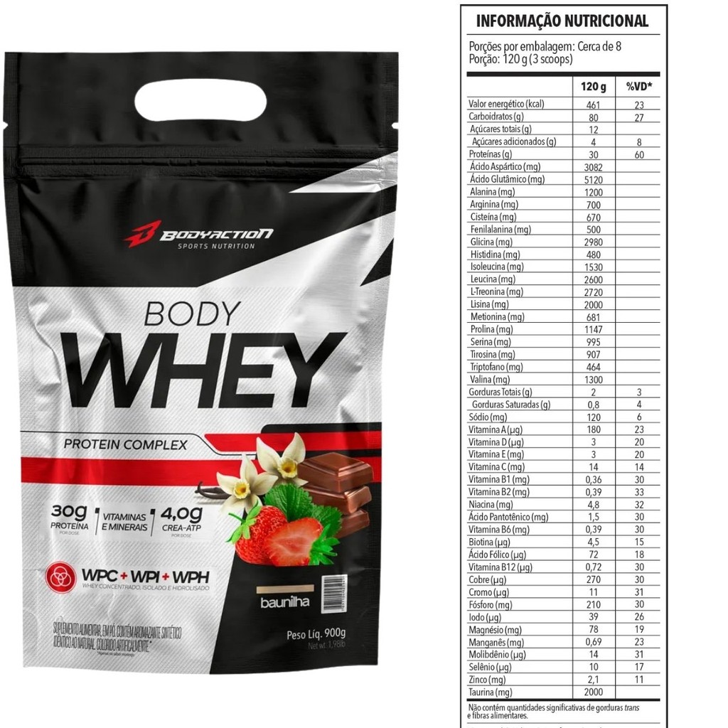 O 100% Whey Prime Bodyaction é um suplemento proteico de alta qualidade, feito com Whey Protein Concentrado (WPC) ultrafiltrado para máxima pureza e rápida absorção. Sua fórmula exclusiva conta com Crea-ATP® (Creatina + Glicina) e alto teor de Glutamina, oferecendo suporte à recuperação muscular, ganho de massa magra e aumento de desempenho. Com 22g de proteína por dose, é ideal para atletas e praticantes de atividades físicas que buscam resultados consistentes. Benefícios: 22g de proteína por dose para construção muscular Crea-ATP® potencializa força, resistência e recuperação Glutamina e BCAAs auxiliam na regeneração e no sistema imunológico Rápida absorção, ideal para o pós-treino Disponível em potes e sachês com sabores variados Indicado para: Atletas e praticantes de musculação focados em hipertrofia Quem busca melhor recuperação e aumento de força Pessoas que necessitam de proteína com alta absorção Modo de uso: Misturar 30g (1 scoop) em 200ml de água ou bebida de preferência Consumir 1 porção ao dia, preferencialmente após o treino Composição e ingredientes principais: Whey Protein Concentrado (WPC) Crea-ATP® (Creatina + Glicina) Glutamina, BCAAs, L-Treonina, Taurina, Biotina Edulcorante natural Stevia e cacau (no sabor chocolate) Nutrientes por porção (30g): Proteína: 22g Carboidratos: 5,7g Açúcares: 3,7g Creatina: 3g BCAAs: 4,2g Glutamina: 1,8g Taurina: 2g Biotina: 4,5mcg Sódio: 65mg Advertências: Não é medicamento Não exceder a dose diária recomendada Não indicado para gestantes, lactantes e crianças Manter fora do alcance de crianças Conservação: Armazenar em local seco, fresco e ao abrigo da luz Após aberto, consumir preferencialmente em até 60 dias 100% Whey Prime Bodyaction: proteína completa para força, desempenho e recuperação muscular.