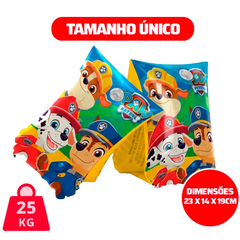 Descrição CARACTERÍSTICAS: - Boia de Braço Patrulha Canina - Peso Máx. 25kg - Composição/Material: PVC de alta resistência - 2 câmaras de ar para maior flutuabilidade - Idade recomendada: + 3 anos - Dimensões aproximadas do produto (A x L) 18 x 14 cm - Inflagem Fácil IMPORTANTE: - É recomendando usar a boia somente em águas onde a criança possa manter-se em pé e esteja sob a supervisão de um adulto. - Este produto não é um equipamento salva vidas. - Este produto deverá ser montado por um adulto antes de ser entregue a criança. - Produto não acompanha kit para reparo. Imagens ilustrativas, as cores e desenhos podem sofrer variações