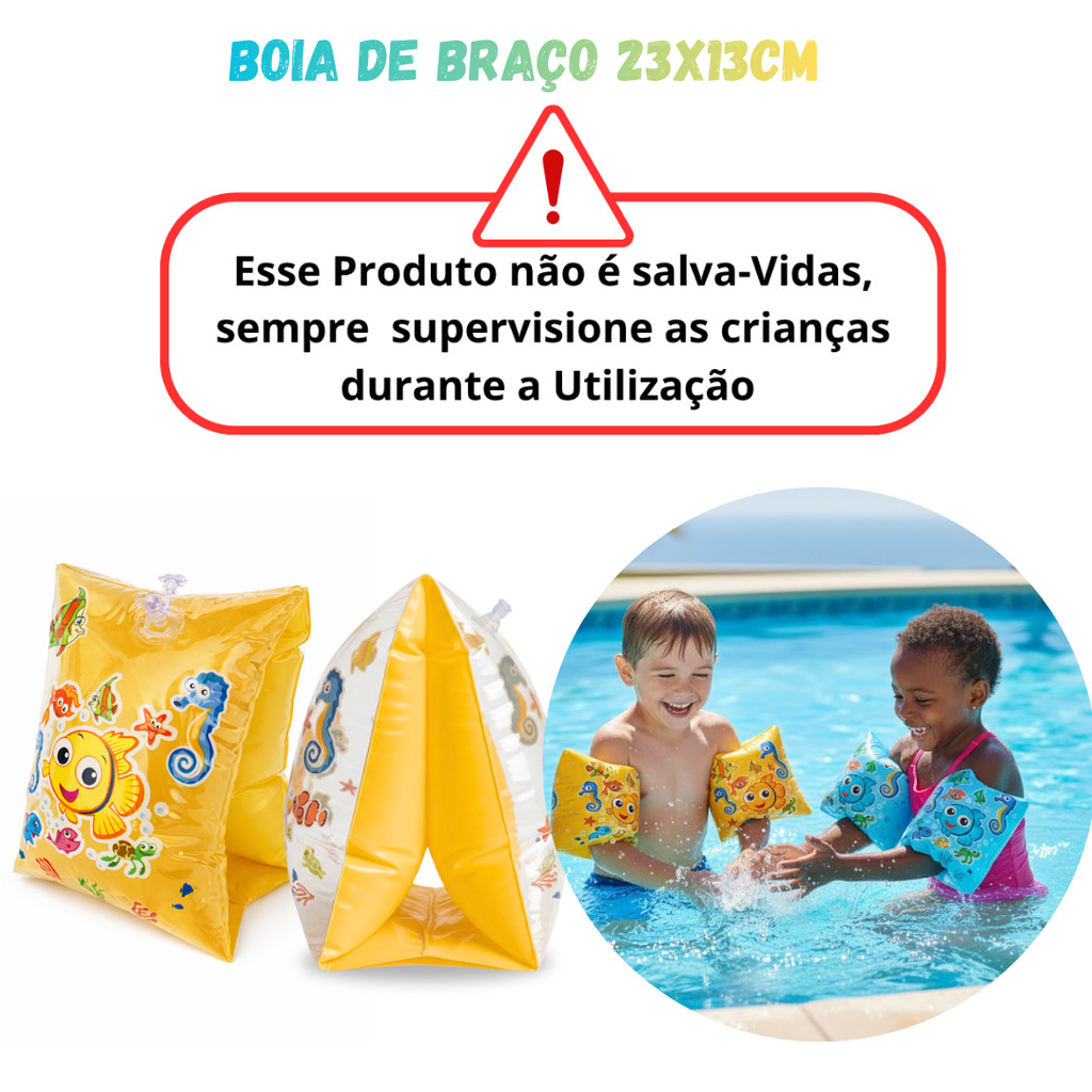 Este produto auxilia na flutuação, mas não substitui a supervisão constante de um adulto. Não é equipamento salva-vidas. ✅ Indicação de uso: Idade recomendada: 2 a 6 anos Peso suportado: até 30 kg Medidas: 23 cm x 13 cm ⚠️ Importante: Essas medidas são apenas referências, pois o que realmente influencia é: o peso da criança, a circunferência do braço, e o nível de conforto/ajuste. COMO UTILIZAR: Inflar a boia até ficar firme, sem excesso de ar Colocar cuidadosamente nos braços da criança Ajustar para que fique confortável e bem posicionada Utilizar sempre com supervisão de um adulto Deixe a criança curtir a piscina com mais segurança, confiança e diversão. A boia de braço infantil foi desenvolvida para auxiliar crianças nos primeiros contatos com a água, oferecendo apoio flutuante, mais estabilidade e tranquilidade para os pais durante momentos de lazer. Ideal para uso em piscinas, clubes e praias, ela ajuda a criança a se sentir mais segura enquanto brinca, aprende a se movimentar e ganha confiança no ambiente aquático. Auxilia a flutuação dos braços, oferecendo mais estabilidade Ajuda crianças que estão aprendendo a se adaptar à água Mais tranquilidade para os pais durante o uso Produto leve, confortável e fácil de usar Ideal para momentos de lazer em família