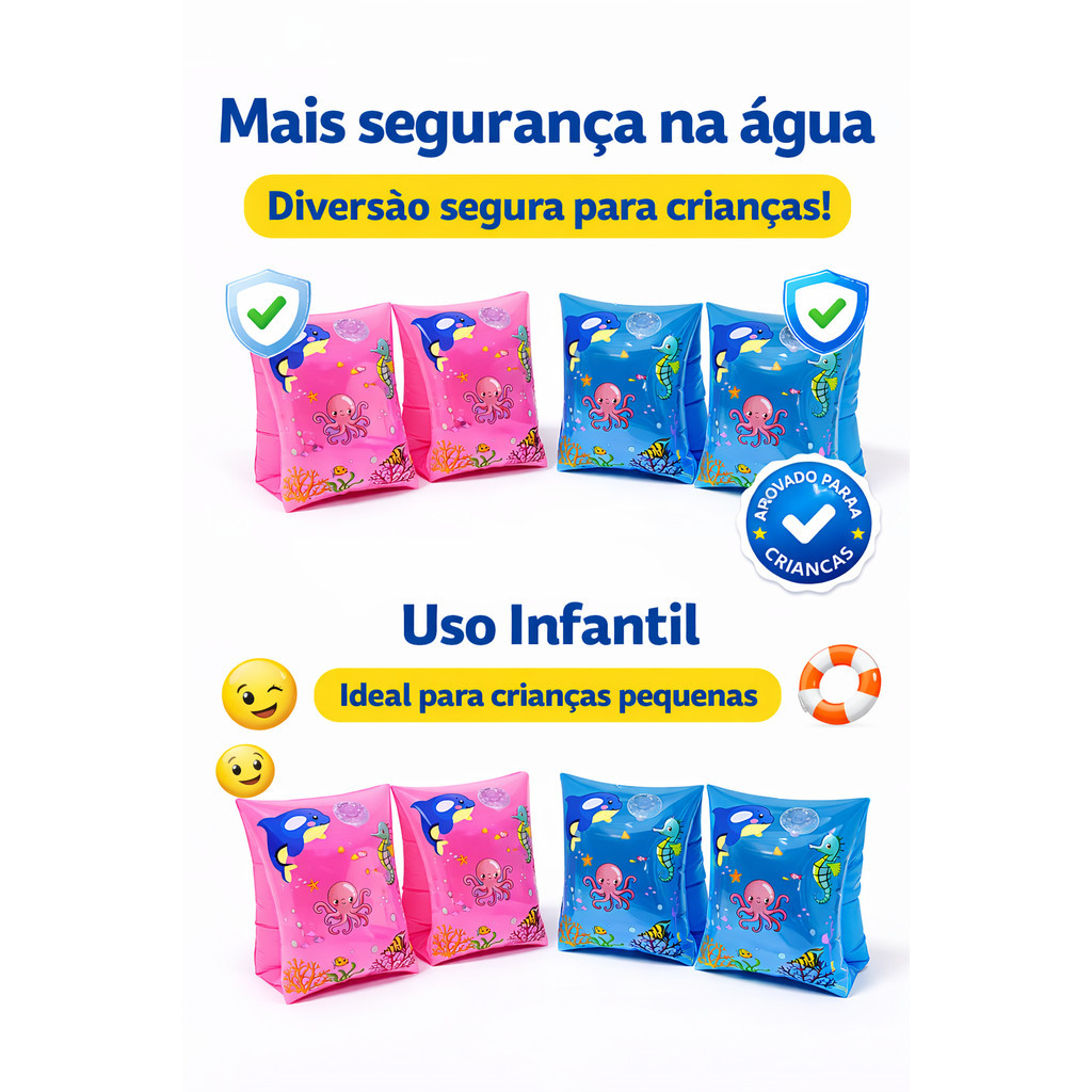 Kit Boia de Braço para Bebês – Segurança e Conforto na Água O kit de boias de braço para bebês foi desenvolvido para auxiliar na flutuação e proporcionar mais segurança durante atividades aquáticas. Ideal para uso em piscina, praia ou áreas de lazer, ajuda o bebê a se adaptar ao contato com a água de forma mais tranquila e controlada. Fabricadas em PVC atóxico, as boias são leves, confortáveis e fáceis de usar. O formato anatômico se ajusta aos braços do bebê, permitindo liberdade de movimentos enquanto oferece suporte adicional durante o banho ou momentos de diversão na água. Produto indicado para uso recreativo, sempre com supervisão constante de um adulto. Características do Produto Kit com 2 pares de boias de braço Material: PVC atóxico Produto inflável Leve e confortável Auxilia na flutuação e adaptação à água Especificações Técnicas Dimensões aproximadas: 14 x 16 cm Indicação de idade: 0 a 2 anos Cores disponíveis: Rosa com laranja Verde com azul Indicação de Uso Ideal para piscina, praia e lazer aquático Indicado para bebês dentro da faixa etária recomendada Informações Importantes Este produto não substitui colete salva-vidas homologado Utilizar somente sob supervisão constante de um adulto As cores do produto podem apresentar pequena variação devido à iluminação e configuração de tela Informações de Envio Produto à pronta entrega Envio no próximo dia útil após confirmação do pagamento