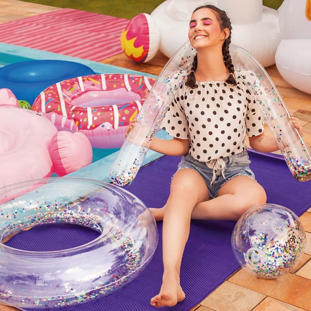 Brilhe mais que o sol neste verão com a Boia Inflável com Glitter! Ela é transparente e com glitters coloridos, ideal para bons momentos na praia ou piscina. Com 80cm de diâmetro, suas medidas permitem a utilização por adultos e crianças. É produzida em vinil resistente, indicada para crianças acima de 3 anos e suporta até 45 Kg. Contém uma câmara de ar independente e uma válvula de segurança, acompanhando um adesivo para reparo que pode aumentar sua vida útil. Desinflada, torna-se fácil de transportar, podendo ser levada para qualquer lugar para garantir a diversão do verão!Atenção! Este não é um equipamento salva-vidas. Nunca deixe crianças sozinhas perto da água sem supervisão de um adulto.