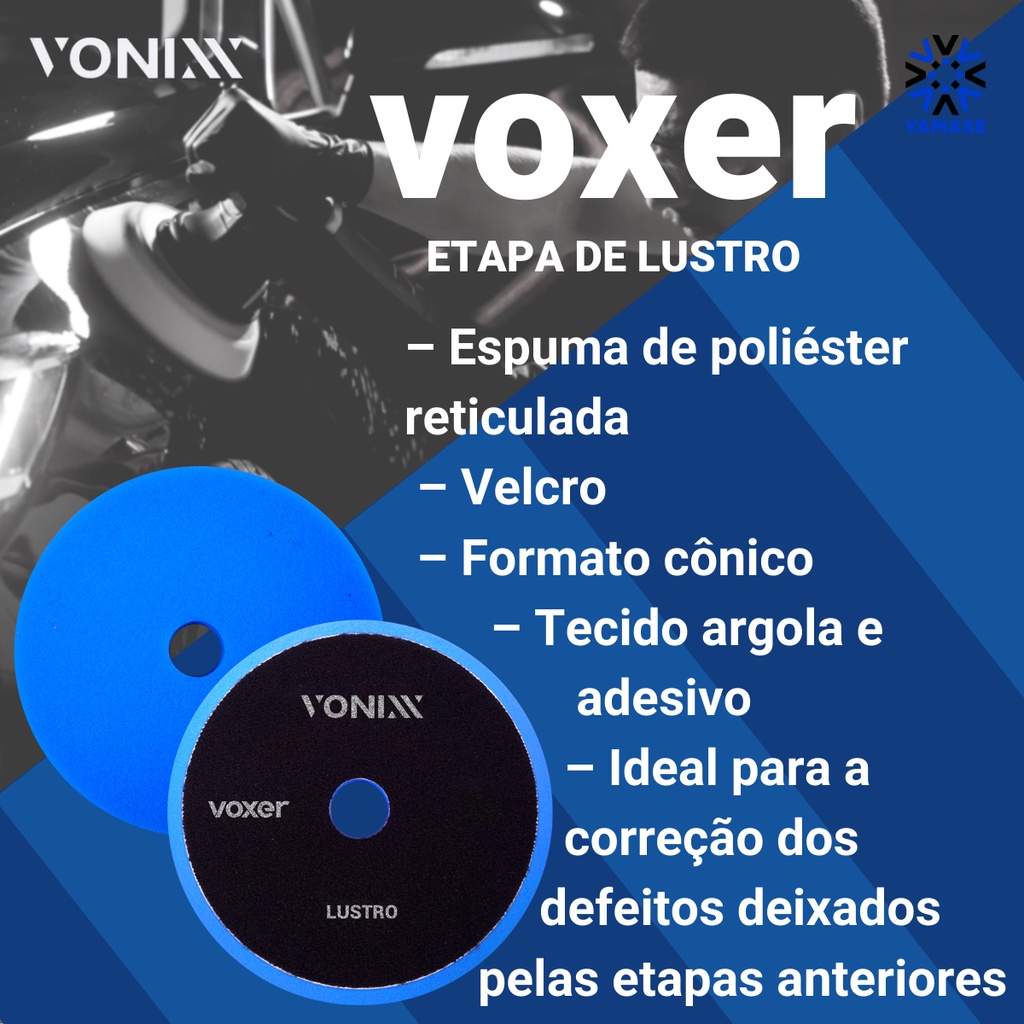 BOINA VOXER LUSTRO 6 POLEGADAS DESCRIÇÃO: Boina Voxer Lustro foi desenvolvida para etapa de lustro. Ideal para a correção dos defeitos deixados pelas etapas anteriores do polimento. Proporciona um excelente acabamento e brilho na superfície. Pode ser utilizada em máquina de roto-orbital ou rotativa.