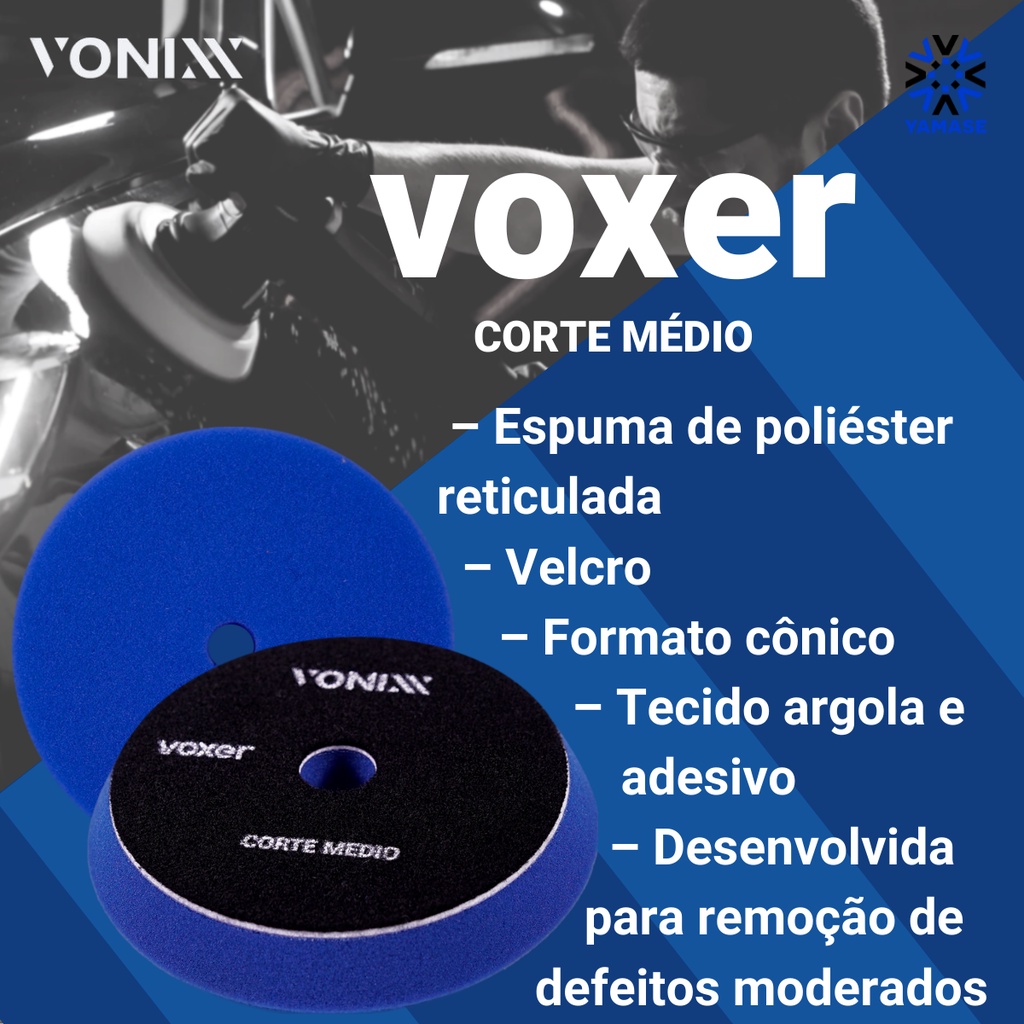 BOINA AZUL ESCURO VOXER CORTE MÉDIO 6 POLEGADAS DESCRIÇÃO: Boina Voxer Corte Médio foi desenvolvida para remoção de defeitos moderados. Proporciona um excelente nível de acabamento. É indicada, também, para ser utilizada com produtos one step (All in one). Pode ser utilizada em máquina de roto-orbital ou rotativa.
