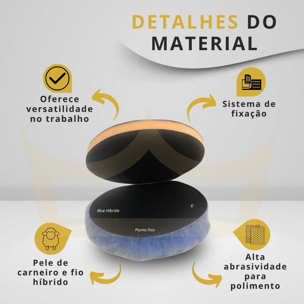 Quer polimento profissional com corte agressivo e acabamento perfeito? Características do Produto: – 1 Boina Híbrida Blue Fibra, Sistema de Aderência Pluma Fixa, agressiva – 1 Interface removível com sistema de aderência Pluma Fixa – Diâmetro: 6 polegadas – Material: pele de carneiro com inserção de fio híbrido – Uso indicado com massas de polir para funilaria e pintura – Velocidade recomendada até 1400 RPM – Sistema de fixação pluma fixa para melhor aderência Por que escolher este produto: – Corte rápido com mínimo risco de hologramas – Feita com equipamentos automatizados e balanceamento mecânico para alta qualidade – Ideal para detalhes e áreas de difícil acesso como laterais, soleiras, faróis e teto solar – Facilita o polimento técnico com máximo controle – Interface removível para troca rápida e segura Dicas de Uso: – Use uma boina para cada produto para melhores resultados – Mantenha a boina plana para evitar marcas e superaquecimento – Remova excesso de pelos da boina nova antes do uso Perguntas Frequentes: – Serve para politriz elétrica e máquina orbital? Sim, ideal para ambos com adaptação correta. – A boina deixa marcas? Não, se usada corretamente e na velocidade recomendada. Garanta já sua Boina Híbrida Blue Fibra!
