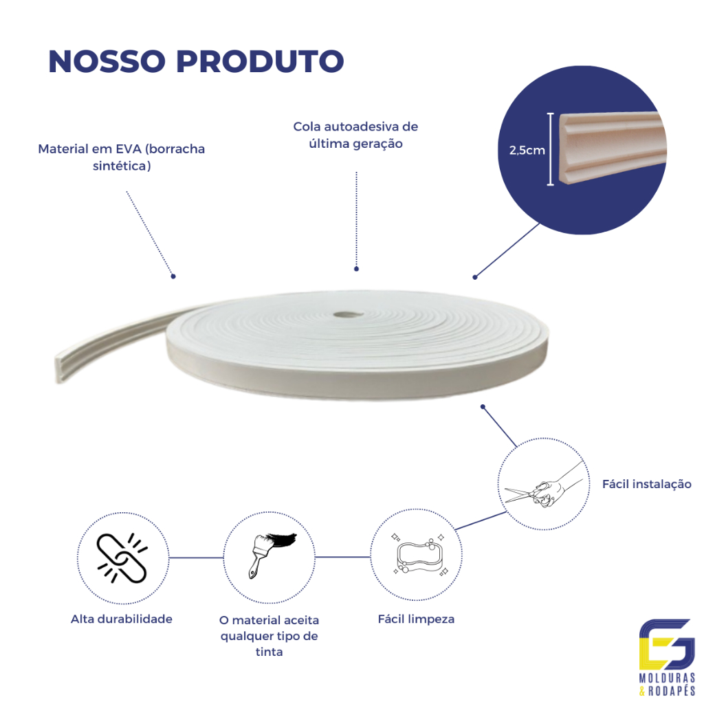 Material: EVA (borracha sintética) autocolante. Dimensões: 2,5cm de largura x 8mm de espessura. Metragem: disponível na variação. Cor: disponível na variação. Comprando mais de uma unidade do mesmo material, enviamos em um único rolo até 25 metros para evitar desperdício na aplicação! Exemplo: 1 unidade de 5 metros – 1 rolo com 5 metros 3 unidades de 5 metros – 1 rolo com 15 metros 6 unidades de 5 metros – 1 rolo com 25 metros + 1 rolo com 5 metros Atenção: R$ 8,40 equivale a 1 metro e R$ 42,00 equivale a 5 metros Sobre o produto: - Atóxico, inodoro, lavável e 100% reciclável; - Substitui com sucesso as molduras, roda meio e boiserie de madeira e isopor; - Instalação simples, rápida e sem sujeira; - Podem ser pintados com qualquer tipo de tinta; - Material lavável, à prova de água e não apodrece; - Autocolante em superfícies lisas e limpas, basta retirar o papel siliconado da dupla face e pressionar contra o local da instalação. * Para situações com: - Paredes irregulares e rusticas; - Papéis de parede; - Texturas acrílica; - Reboco cru; - Áreas externas; - Áreas úmidas; - Locais sujeitos a sol, chuva e maresia. É necessário a utilização de cola de contato/sapateiro para auxiliar a adesivação * Qualquer dúvida, estamos à disposição :) *** GeMolduras e Rodapés ***