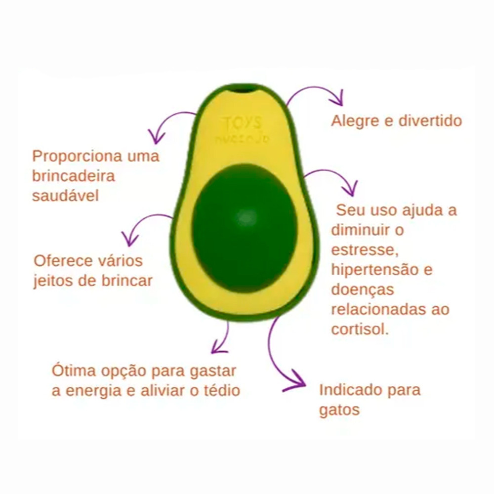 Indicado para gatos; - Bolinha giratória com CatNip a erva do gato; - Auxilia o gato nos momentos de tédio e ansiedade; - Com fita adesiva para fixação; - Produto 100% natural. O Catnip é uma ótima opção para distrair o seu gato e ajudá-lo a relaxar em momentos de estresse, tédio ou ansiedade. Além disso, é uma ótima forma de incentivar o seu gato a brincar e se exercitar. E o melhor de tudo é que o catnip é seguro para os gatos! A erva é completamente não tóxica e não causa dependência, então você pode oferecê-la ao seu gato sem preocupações. A bolinha giratória catnip em formato de abacate mantém o felino mais feliz, ajuda na limpeza dos dentes, tem fácil utilização e 100% natural. Medidas aproximadas Abacate: 6cm Diâmetro bolinha Catnip: 2,5cm