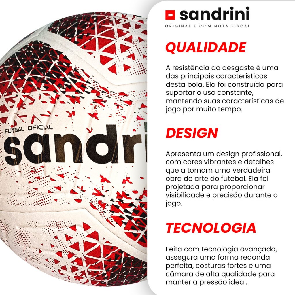 *ATENÇÃO* Antes de calibrar sua bola Sandrini, verifique com cuidado a válvula, pois ela é removível. Para evitar danos ou vazamentos, não force a agulha na hora de calibrar. Recomendamos inserir a agulha com cuidado, respeitando o limite de pressão indicada. Sandrini bola futsal AXIS SR 500 oficial | REF: 2069/2065 Sobre o item A Bola Futsal Sandrini AXIS SR 500 foi projetada para quem busca alta qualidade em jogos e treinos, unindo padrão oficial, perfil profissional e alto desempenho. O laminado em PU de alta resistência com material TPU garante toque preciso e excelente controle, enquanto a construção Techfusion com câmara Inject Air mantém a pressão por mais tempo e entrega quique consistente em quadra. Disponível nas combinações branca/azul e branca/vermelha, é resistente, durável e pronta para futsal recreativo, treino e partidas com exigência técnica. Especificações técnicas Marca: Sandrini Modelo: AXIS SR 500 REF: 2069/2065 Material/laminado: TPU | PU (poliuretano de alta resistência) Câmara: Inject Air Tipo de costura: Techfusion Gomos: 6 peças Válvula: Miolo de silicone embutido Circunferência: 62–64 cm (padrão oficial futsal) Peso: 400–410 g (padrão oficial futsal) Cores: Branca/Azul e Branca/Vermelha Indicações de uso: Futsal em quadra, futebol recreativo em piso liso, treino e jogos Benefícios e cuidados Benefícios toque macio com resposta firme para passes e finalizações, controle superior graças ao laminado PU/TPU e estabilidade de quique proporcionada pela câmara Inject Air. A estrutura Techfusion aumenta a durabilidade e a resistência ao desgaste, mantendo o desempenho por muitos ciclos de jogo. Cuidados utilizar em quadras e pisos lisos; evitar superfícies abrasivas. Limpar com pano úmido e sabão neutro após o uso e guardar em local arejado. Não expor a calor excessivo. Calibrar conforme preferência de jogo (verificar pressão periodicamente para preservar a câmara). Tabela de medidas Circunferência: 62–64 cm Peso: 400–410 g Gomos: 6 Dica: meça a circunferência com fita e ajuste a pressão até alcançar o quique desejado; variações dentro do padrão oficial são normais e não comprometem o desempenho. Política de devolução Aceitamos devolução por arrependimento dentro do prazo legal, desde que o produto esteja sem sinais de uso e com a embalagem original. Nossa equipe está pronta para orientar no processo. FAQ O produto é original? Sim, todos os produtos são 100% originais. Acompanha nota fiscal? Sim, todos os produtos com nota fiscal e garantia de procedência. Posso trocar minha escolha depois de finalizar a compra? Não é possível alterar após a compra. Produtos são enviados conforme selecionado. É tamanho oficial de futsal? Sim. Circunferência de 62–64 cm e peso de 400–410 g seguem o padrão oficial da modalidade. Serve para society ou campo? Não. É específica para futsal/quadra; para gramado sintético ou natural, prefira bolas próprias para essas modalidades. Sobre a Sandrini A Sandrini é referência desde 2011 em moda masculina, esportes e saúde, com foco em qualidade, conforto e satisfação total. Atuamos com tênis, cuecas, shorts/bermudas, camisetas e itens de esporte (bolas e chuteiras), além de saúde (meias de compressão e bota ortopédica). Reconhecida pela excelência no atendimento e pela variedade, fomos premiados em 2022 como a maior loja do marketplace. Imagens ilustrativas. As cores podem variar de acordo com o lote ou sua tela/monitor. Garantia do vendedor: 30 dias