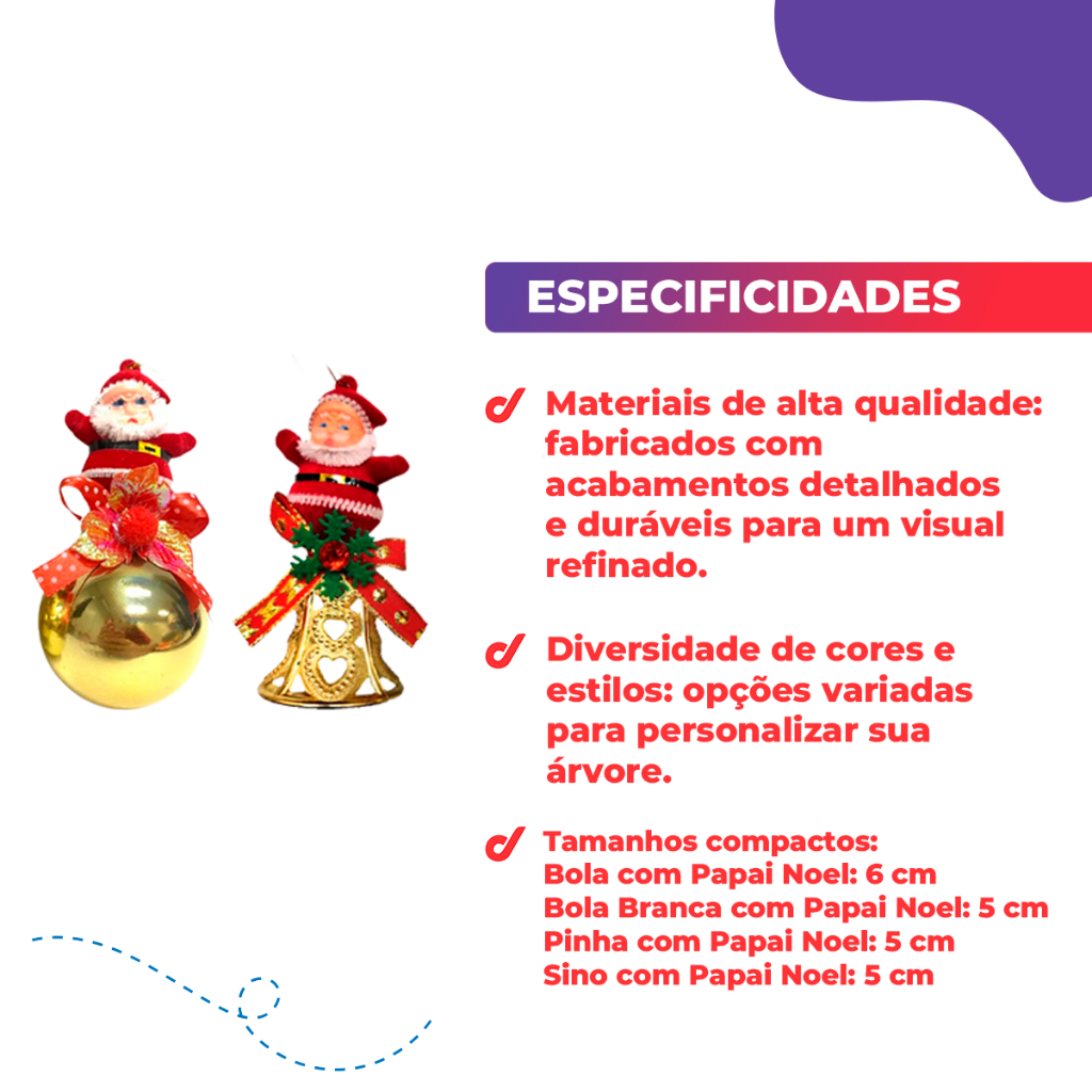 Decore sua árvore de Natal com um toque especial! Os Pingentes Diversos de Natal são ideais para quem deseja adicionar charme e variedade à decoração festiva. Com designs encantadores e detalhados, cada pingente traz elementos tradicionais e modernos do Natal, como estrelas, árvores de Natal, sinos, papais noéis e flocos de neve. Feitos com materiais de alta qualidade e acabamento impecável, esses pingentes são perfeitos para criar uma atmosfera mágica e acolhedora. Disponíveis em diversos estilos e cores, são perfeitos para quem quer personalizar sua decoração e espalhar alegria e espírito natalino. Ideal para presentear ou para dar aquele toque final à sua árvore. Bola com papai noel: 6cm Bola Branca com Papai Noel: 5cm Pinha com Papai Noel: 5cm Sino com Papai Noel: 5cm