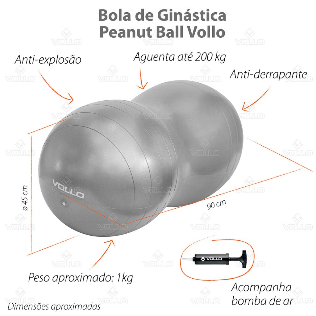 Bola Feijão para Ginástica Peanut Ball Vollo 45cm A Bola Feijão Peanut Vollo é indicada para exercícios físicos como pilates, ginástica, yoga, alongamento e tratamentos fisioterápicos. Aliar a bola com alguma modalidade física, proporciona maior coordenação motora, equilíbrio, flexibilidade, além de desenvolver a musculatura corporal, melhorando muito sua qualidade de vida. A bola feijão da Vollo foi desenvolvida por um material altamente resistente, suportando até 200kg e antiderrapante que garante melhor aderência sobre o piso. E tem mais, a bola possui tecnologia anti explosão que se for perfurada, a bola se esvazia lentamente assegurando maior segurança ao praticante. Garanta já a sua Bola Feijão Peanut Vollo e de início a sua rotina de saúde e bem estar! Principais Benefícios da Bola de Ginástica Feijão Peanut Ball • Melhora o equilíbrio corporal e coordenação motora • Ajuda no fortalecimento muscular • Aumento da flexibilidade • Alívio das tensões • Estimula o tônus muscular • Correção da postura • Melhoria da circulação sanguínea • Exercícios para o desenvolvimento infantil Especificações Bola Feijão • Composição: PVC (policloreto de vinila) • Cor: Cinza • Peso Suportado: 200kg • Incluso: 1 Bomba de Ar • Peso aproximado: 1 kg • Dimensões aproximadas: 45 x 45 x 90 cm • Sistema Anti Explosão e Antiderrapante