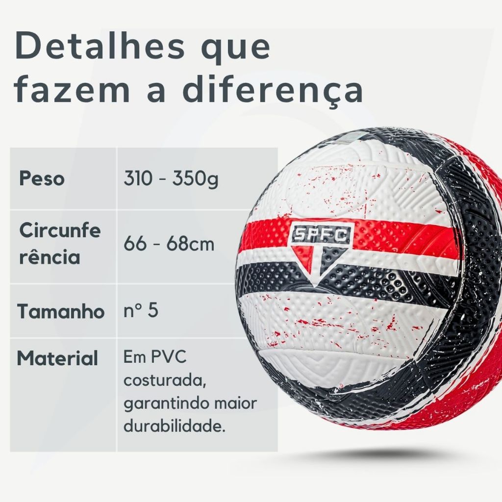 Bola de Futebol São Paulo Futebol Clube CARACTERÍSTICAS: • Design com relevo: Proporciona maior facilidade no controle de bola • Formato sem costura: Ideal para alto desempenho, mesmo em condições adversas • Material: Desenvolvida com materiais de alta qualidade • Composição: Policloreto de Vinila (PVC) • Peso aproximado: 420 g • Medidas: 68 cm de circunferência • Calibragem recomendada: 06-08 libras A Bola de Futebol São Paulo é perfeita para os apaixonados pelo Tricolor que desejam brilhar em campo. Seu design foi pensado para oferecer máxima performance e controle, destacando o amor pelo São Paulo em cada jogada. Com tecnologia que elimina as costuras, esta bola garante precisão e resistência, permitindo que você jogue com excelência em diferentes condições. Ideal para marcar grandes golaços e exibir toda a paixão pelo futebol e pelo São Paulo Futebol Clube. BENEFÍCIOS: • Controle superior graças ao design com relevo • Maior resistência e desempenho em partidas intensas O QUE ESTÁ INCLUSO? • 1 Bola de Futebol São Paulo Futebol Clube INFORMAÇÕES ADICIONAIS: • Confira outros modelos em "MAIS ANÚNCIOS DO VENDEDOR" • Todos os pedidos acompanham nota fiscal emitida para o CPF/CNPJ informado na compra • ////PRODUTO ORIGINAL//// Não trabalhamos com falsificações • Precisa de ajuda? Utilize o campo de perguntas para esclarecer suas dúvidas diretamente com nossos atendentes