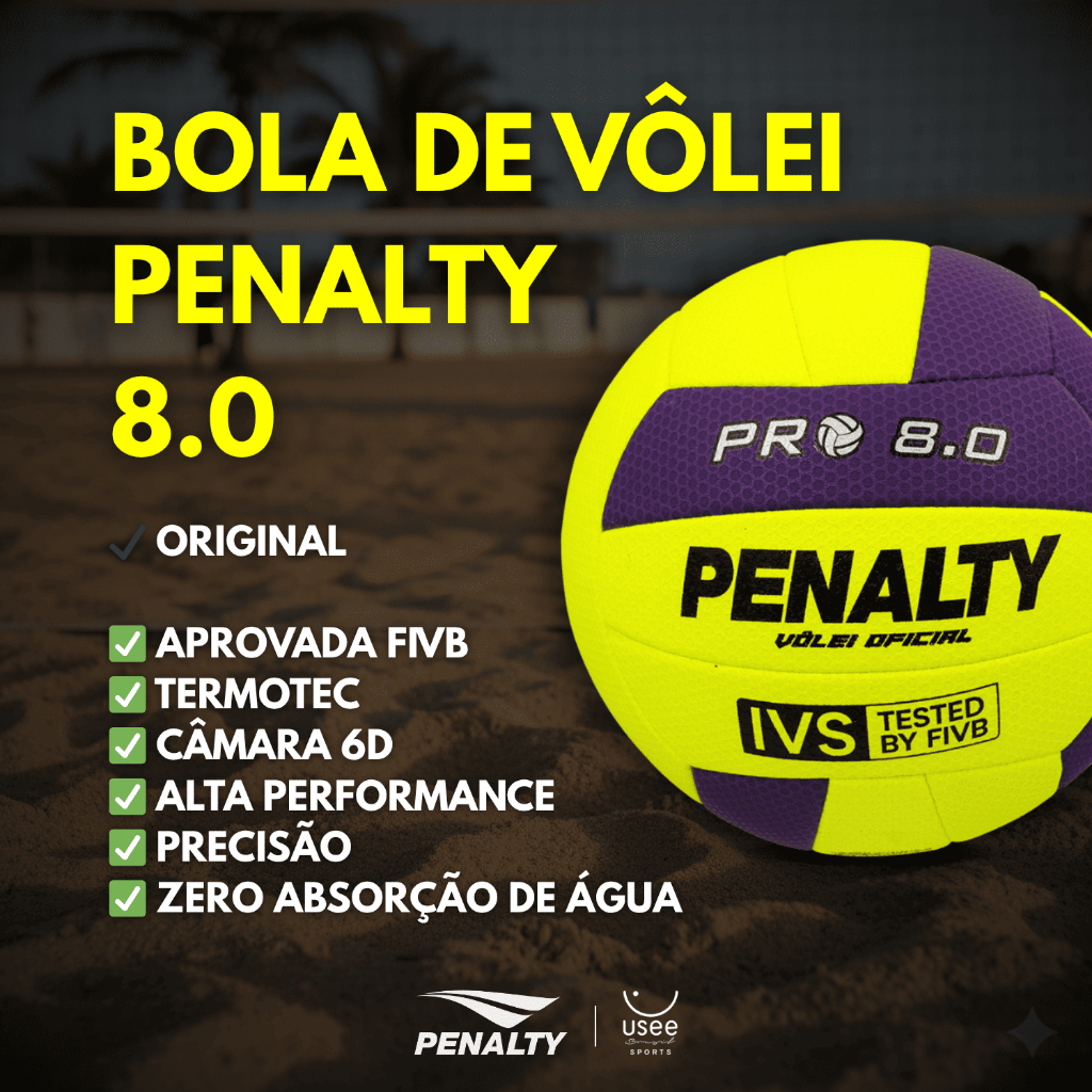 Bola Vôlei 8.0 Pro IX Penalty A Bola de Vôlei Penalty 8.0 Pro é a escolha ideal para jogadores de todos os níveis, desde iniciantes até profissionais. Se você está se preparando para uma partida descontraída com a galera ou buscando melhorar seu desempenho durante os treinos e competições, essa bola vai te ajudar a alcançar o melhor resultado. Desenvolvida para proporcionar um toque preciso e um ótimo controle, ela é perfeita para jogos em quadra e treinos intensivos. Garanta a sua e eleve o seu jogo a um novo nível! Diferenciais: - Aprovada pela Federação internacional de Voleibol (FIVB). - Presente nas Federações Catarinense de Vôlei ( FCV ), Federações Paranaense de Vôlei ( FPV) e Federações Paulista de Vôlei ( FPV ). - Alta performance durante as jogadas. - Equilíbrio e precisão no contato. - Resistente a absorção de água. Características: - Peso: 260-280g - Circunferência: 65-67cm - Gomos: 18 - Laminado: Microfibra - Construção: Termotec - Câmara: 6D - Câmara Interna: Neotec - Sistema de Forro: Termofixo - Selo: IVS - Tested by FIVB - Miolo: Cápsula SIS Cuidados: - Limpar a bola com escova ou pano limpo levemente úmido com água após utilização. - Secar a bola por completo. - Armazenar em ambiente seco e ventilado. - Não deixar exposta ao sol ou chuva. - Mantê-la sempre calibrada. A Bola Vôlei 8.0 Pro IX Penalty pode ser encontrada aqui na Usee Brasil! Sobre a Usee Brasil: A Usee Brasil é uma empresa brasileira que oferece uma variedade de produtos de alta qualidade, desde roupas e acessórios até itens para casa. Tenha uma experiência conosco!