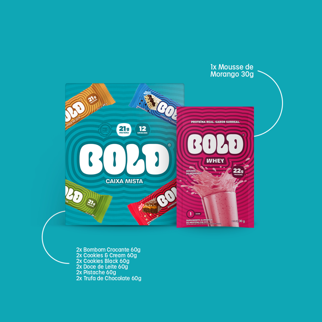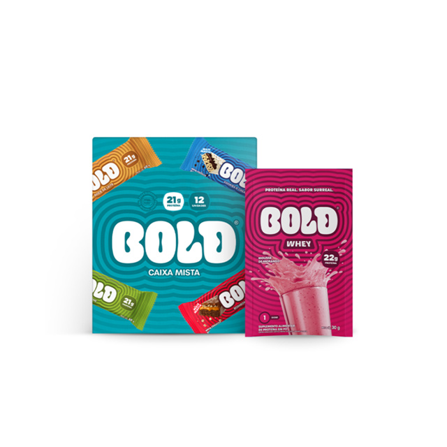 Segue a descrição ajustada, clara e pronta para ecommerce, sem citar o sabor do whey, mantendo foco comercial e evitando ruído de informação. Caixa Mista BOLD + Whey Protein Sachê 30g A Caixa Mista BOLD foi criada para quem busca variedade, praticidade e alto valor nutricional no dia a dia. O kit combina uma seleção completa de produtos BOLD em versões individuais com 1 sachê de whey protein, ideal para complementar a rotina de treinos ou consumo de proteína ao longo do dia. É uma opção estratégica para quem quer experimentar diferentes produtos da marca, manter a alimentação funcional e ter conveniência sem abrir mão da qualidade.