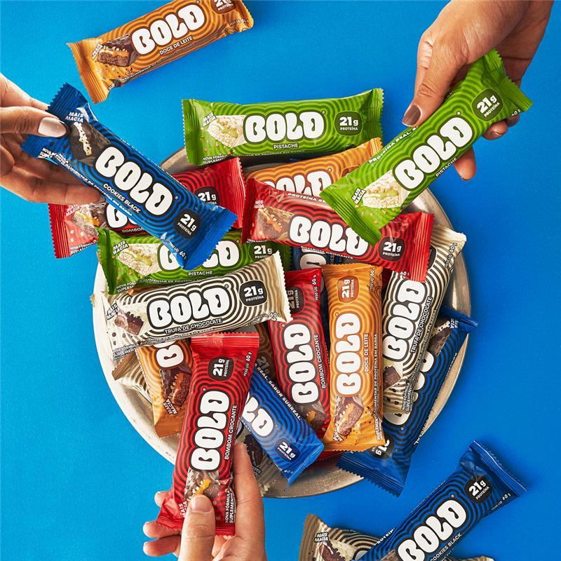 Bold Caixa Mista com 12 Barras de Proteína Cada caixa contém 12 barras de 60 g com 21 g de proteína, em um mix com 6 sabores diferentes. Sabores (2 de cada): • Bombom Crocante • Cookies Black • Cookies & Cream • Doce de Leite • Pistache • Trufa de Chocolate ✔ 21 g de proteína por barra ✔ 12 unidades na caixa ✔ Mix com 6 sabores ✔ Textura mais macia ✔ Ideal para pré ou pós treino