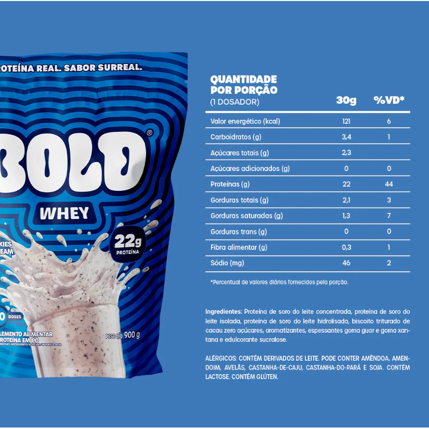 O Bold Whey Protein 900g Cookies and Cream é o suplemento ideal para quem busca ganhar massa magra, melhorar a recuperação muscular e complementar a ingestão diária de proteínas com muito mais sabor. Com fórmula de alta qualidade, baixo teor de gorduras e carboidratos, ele é perfeito para atletas e pessoas que desejam mais energia e desempenho no dia a dia. ℹ Benefícios ✅ Auxilia no ganho e manutenção da massa magra ✅ Contribui para a recuperação e desempenho muscular ✅ Sabor Cookies and Cream delicioso e cremoso ✅ Fonte de proteínas de alto valor biológico ✅ Baixo teor de gorduras e carboidratos ✅ Ideal para consumo no pré e pós-treino ℹ Ficha Técnica ✅ Produto: Bold Whey Protein 900g Cookies and Cream ✅ Ingredientes: Proteína concentrada do soro do leite (WPC), cacau em pó, aroma idêntico ao natural de cookies, edulcorantes e espessantes (pode conter traços de soja e glúten – conforme fabricante) ✅ Modo de uso: Diluir 30g (aprox. 1 dosador) em 200ml de água ou leite e consumir preferencialmente antes ou após o treino, ou conforme orientação profissional ✅ Armazenamento: Conservar em local fresco, seco e ao abrigo da luz solar