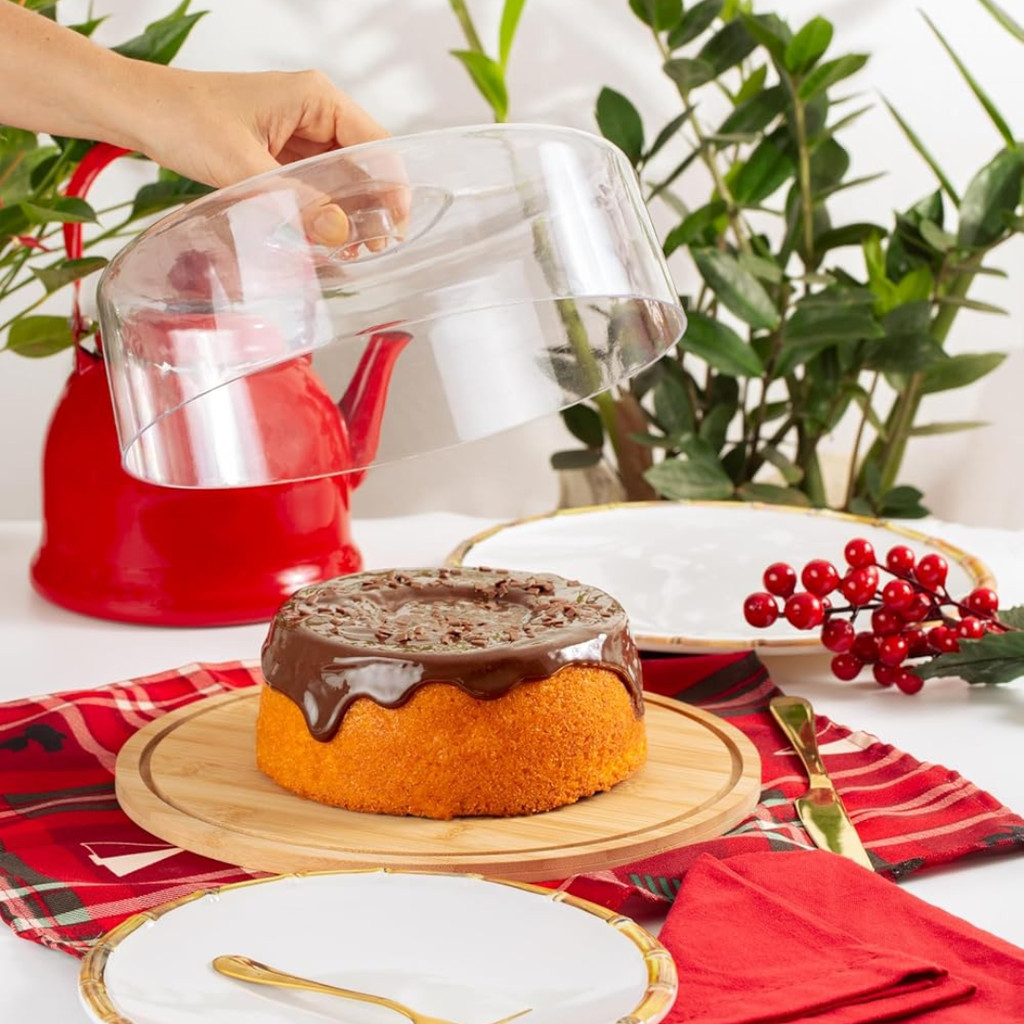 Boleira Bambu Com Tampa Em Acrílico Porta Bolo Para Bolo Torta Pudim Queijo 28cm