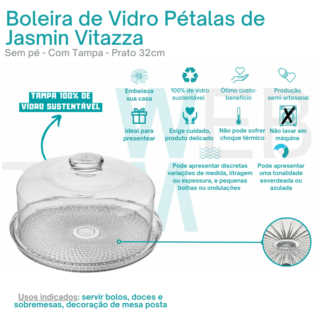**POR QUESTÕES DE SEGURANÇA NO ENVIO, POR GENTILEZA, COMPRAR NO MÁXIMO 02 UNIDADES POR PEDIDO** Esse kit contém: 1 base de vidro sem pé Vitazza 1 tampa de vidro Importante: Os produtos Vitazza são feitos 100% de vidro sustentável e de qualidade, sem perder a resistência e a durabilidade, garantindo um preço justo e melhor custo x benefício. Por serem feitos semi-artesanalmente e com vidro sustentável, são características suas: conter discretas variações de medida, litragem ou espessura, pequenas bolhas ou ondulações, e coloração azulada/esverdeada. As tampas por sua vez, podem ser mais delicadas e requerem um manuseio mais cuidadoso. Mas todos os produtos passam por um critério de qualidade que garantem sua utilização. Boleira com Tampa de Vidro Vitazza: Sua Solução Elegante para Organização e Decoração! Procurando por um toque especial para organizar sua cozinha, sala de estar ou outros espaços? Apresentamos a nossa Boleira com de Vidro Vitazza, a solução perfeita para organizar e decorar com estilo. Se te faltam lugares bonitos e práticos para armazenar e exibir suas delícias culinárias de maneira organizada e charmosa, imagine finalmente ter um espaço dedicado para suas sobremesas, que também sirva como peça de decoração. Com a nossa boleira, você terá uma solução versátil que se adapta a qualquer ocasião: uma reunião de amigas, um jantar especial ou até mesmo um momento só seu. Seja você uma dona de casa zelosa ou uma profissional atarefada, a beleza funcional da nossa boleira vai encantar você e seus convidados. Eleve sua decoração e organização a um novo patamar agora mesmo! Benefícios: • Versatilidade: Use para bolos, tortas, cupcakes, petiscos, docinhos, pudins e até mesmo como peça central de decoração. • Elegância: Design em vidro transparente, que adiciona um toque sofisticado a qualquer ambiente ou ocasião, seja ela Natal, festas ou encontros especiais. • Praticidade: Tampa que mantém suas criações fresquinhas e protegidas. • Sustentabilidade: Feita de vidro 100% sustentável, material de qualidade e durabilidade, essa boleira adiciona um toque de consciência ambiental a sua elegância. • Acessível e chic: Beleza e funcionalidade excepcionais a um preço que cabe no seu bolso. Descubra a diversidade desse produto especial: • Escolha entre a opção com pé ou sem pé, temos as duas versões em nossa loja; • Nas opções com pé, temos disponíveis o modelo transparente, vermelho, dourado ou verde – escolha a sua cor favorita! • Se você ama um conjunto, precisa conferir o kit da boleira com a queijeira que tem o mesmo design; • Temos, ainda, a opção do prato com pé sem a tampa – uma opção para quem deseja expor docinhos na mesa da festa ou petiscos. Transforme a maneira como você organiza e decora seu espaço. Chame a atenção das visitas, satisfaça sua paixão por decoração e mantenha suas delícias prontas para serem saboreadas. Com unidades limitadas, essas boleiras estão voando das prateleiras! Garanta a sua agora mesmo e faça da sua casa um lugar ainda mais especial! Ficha Técnica: Modelo: Boleira sem Pé Vitazza Marca: Vitazza Material: Vidro Altura: 16 cm Diâmetro da base: 28 cm Diâmetro da tampa: 25cm Uso e cuidado com o Produto: EXAMINE E MANUSEIE COM CUIDADO, POIS IMPACTOS OU CHOQUES DE TEMPERATURA PODEM PROVOCAR RACHADURAS OU QUEBRA DO PRODUTO, GERANDO RISCO DE CORTES OU FERIMENTOS. NÃO É INDICADO LEVAR O PRODUTO A TEMPERATURAS MUITO ELEVADAS, NEM DEPOSITAR ALIMENTOS QUE NÃO ESTEJAM EM TEMPERATURA AMBIENTE. NÃO PODE IR AO FOGO. NÃO PODE IR À MÁQUINA DE LAVAR LOUÇAS. MANUSEAR A TAMPA DO PRODUTO PELO SEU PUXADOR PARA GARANTIR SUA DURABILIDADE. **IMAGEM MERAMENTE ILUSTRATIVA. A tonalidade das cores do produto pode variar conforme a configuração do seu monitor/celular.**