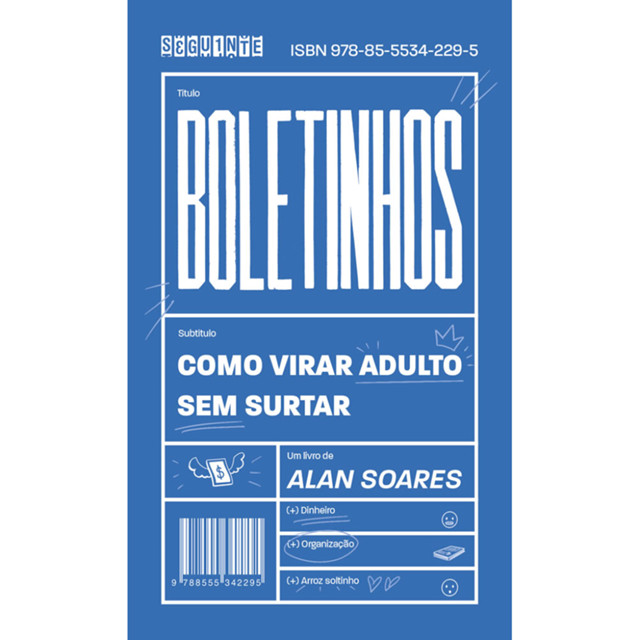 BOLETINHOS COMO VIRAR ADULTO SEM SURTAR O manual de que todo jovem precisa para encarar a vida adulta e fazer as pazes com o dinheiro.O primeiro emprego, os boletos que não param de chegar, as contas que não fecham, a vida social atribulada… Pois é, ninguém falou que ser adulto era fácil, mas você não precisa passar por esse momento sozinho.Boletinhos é o guia perfeito para te acompanhar nessa jornada. O livro explica de forma clara e descontraída como organizar as suas finanças, economizar um pouquinho todo mês e criar hábitos financeiros mais saudáveis. E, como a vida vai muito além do dinheiro, você também vai encontrar orientações sobre assuntos que sempre causam confusão como montar o currículo perfeito? Como declarar o imposto de renda? Dá para começar a investir já no início da carreira?Alan Soares criou o boletinhos para levar aos jovens informações mais acessíveis sobre finanças. Agora a página no Instagram virou este guia que mostra como a vida adulta, apesar de complicada, também pode ser a nossa melhor fase — com independência e liberdade para trilharmos o nosso caminho.. Informações Adicionais Autor: SOARES, ALAN Data Publicação: 30/12/1899 Tipo de capa: BROCHURA Condição do Item: Novo Subtitulo: BOLETINHOS COMO VIRAR ADULTO SEM SURTAR Idioma: INDEFINIDO Páginas: 176 Edição: 1 ISBN-13: 9788555342295 ISBN-10: 8555342295