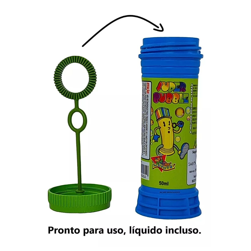 Kit de Bolha de Sabão ideal para revenda no comércio, lembranças de aniversário festa infantil. Bolha de Sabão embalagens plásticas com tema Super Bubble colorido e divertido. Contém 50 ml de líquido para fazer bolhas Observação: Não tem joguinho na tampa! Dimensões: Altura: 10 cm Diâmetro: 3,5 cm Circunferência: 10 cm Validade 36 meses. Testado e aprovado pelo Inmetro mais segurança e qualidade para brincadeira ficar mais divertida!