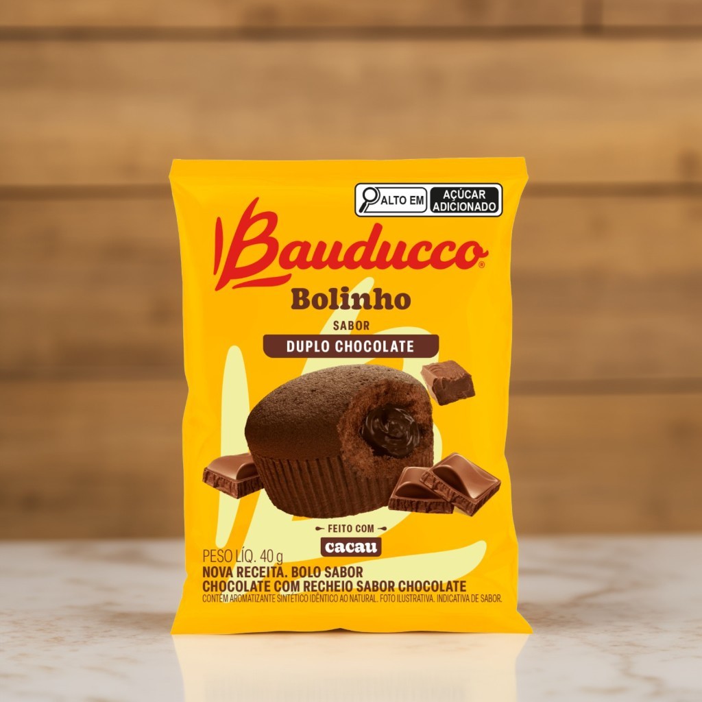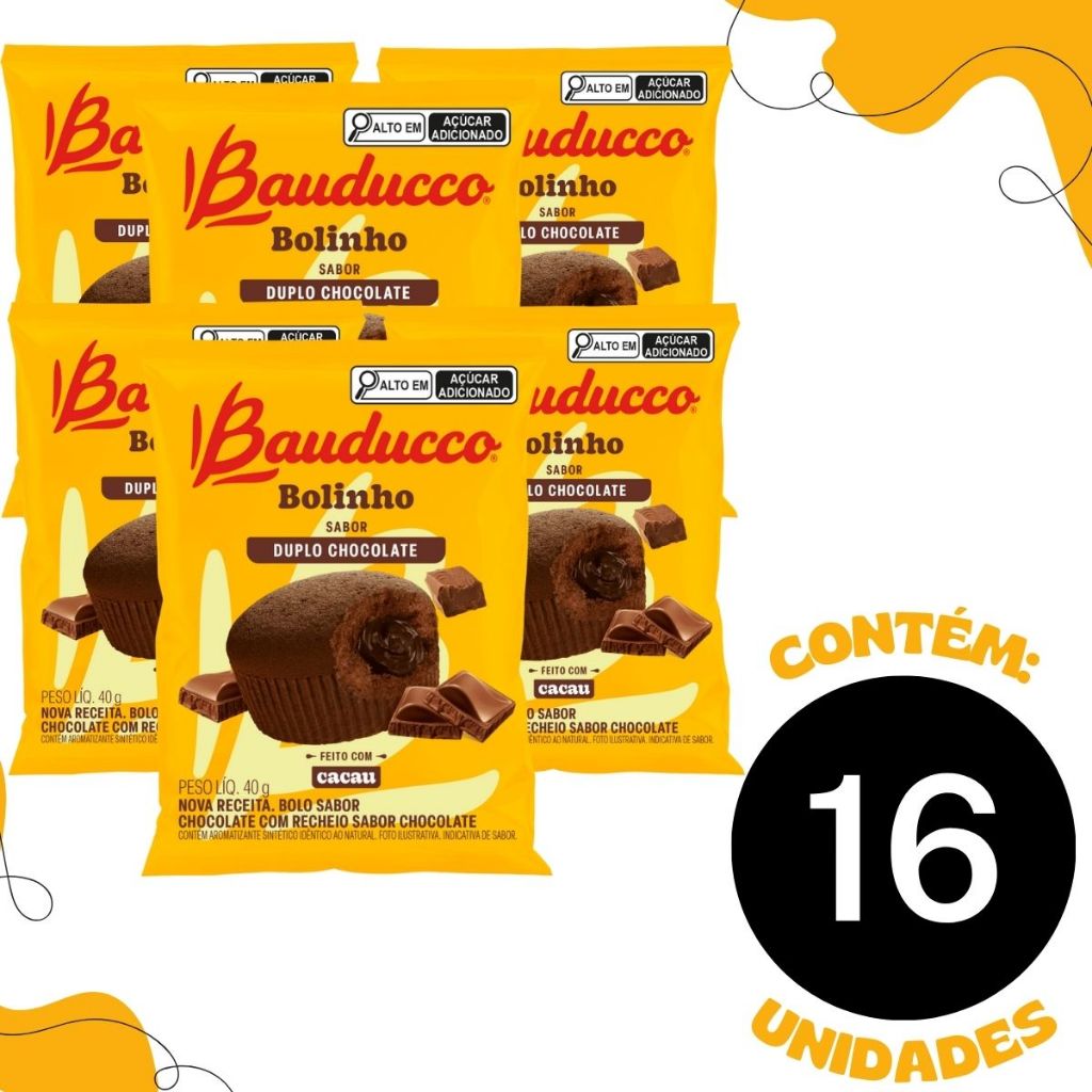 Com nova receita, o Bolinho Bauducco Duplo Chocolate é feito com cacau, tem uma massa macia e fofinha e é uma ótima opção para levar na lancheira. Ingredientes: recheio sabor chocolate (açúcar, açúcar invertido, água, gordura vegetal, cacau em pó, liquor de cacau, fibra de aveia, sal, emulsificante: ésteres de poliglicerol com ácido ricinoléico interesterificado, umectante: glicerina, aromatizantes, conservador: sorbato de potássio, acidulante: ácido fosfórico, estabilizante: goma xantana, corante: dióxido de titânio e gelificante: pectina), açúcar, farinha de trigo enriquecida com ferro e ácido fólico, ovo integral, óleo de canola, leite integral, cacau em pó, mineral e vitaminas (cálcio e vitaminas: b1, b2, niacina, b6 e a), sal, fermento em pó químico (pirofosfato ácido de sódio, bicarbonato de sódio e fosfato monocálcico), aromatizantes, conservador: propionato de cálcio e emulsificante: mono e diglicerídeos de ácidos graxos. Alérgicos: Contém glúten; Contém lactose; Contém ovos, leite, derivados de aveia e de trigo; Pode conter centeio, cevada, amendoim, amêndoa, avelãs, castanha-de-caju, castanha-do-pará, pistaches, soja, gergelim e nozes. Especificações: 1 Caixa C/ 16 unidades. Somos uma loja especializada em artigos de festa, confeitaria, embalagens e atacado em doces com lojas físicas no estado de São Paulo, desde 2002. Imagens meramente ilustrativas, de acordo com nossos fornecedores que nos fornecem. Todas as Informações divulgadas são de responsabilidade do fabricante/fornecedor.