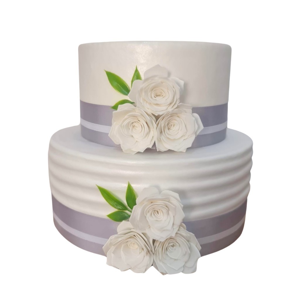 Bolo Fake Branco com fita 2 Andares diâmetro 22 e 17cm