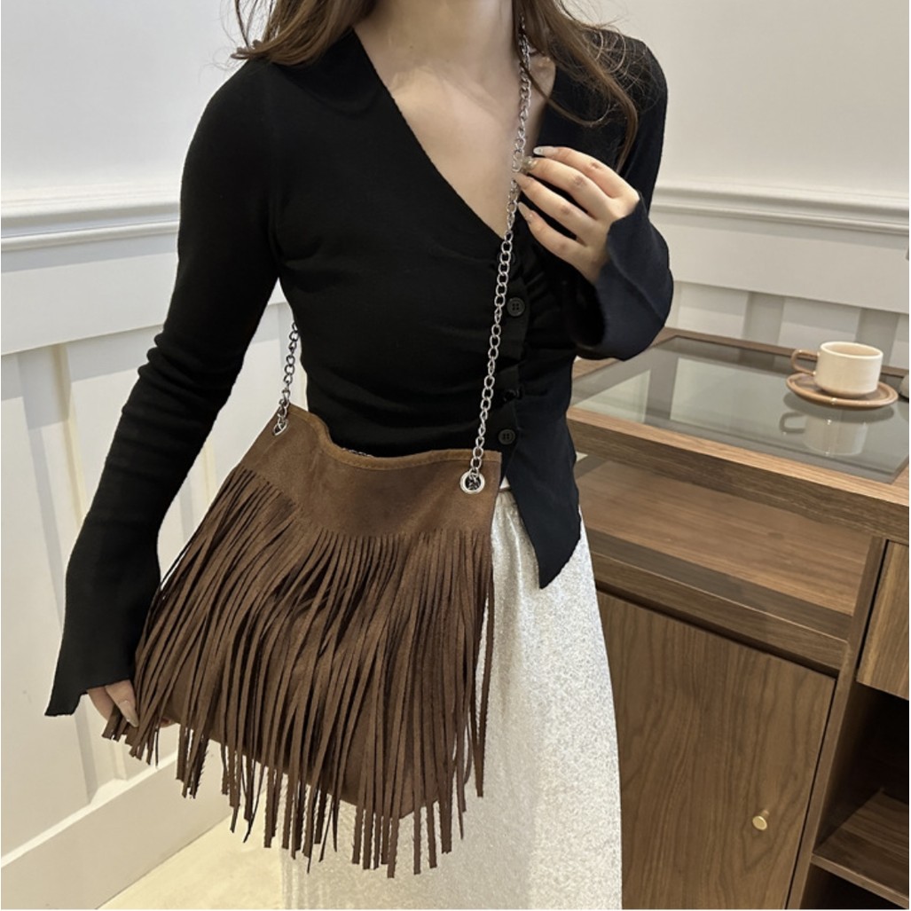 Bolsa boêmia com franjas, bolsa estilo sela vintage em camurça sintética, bolsa de ombro/transversal
