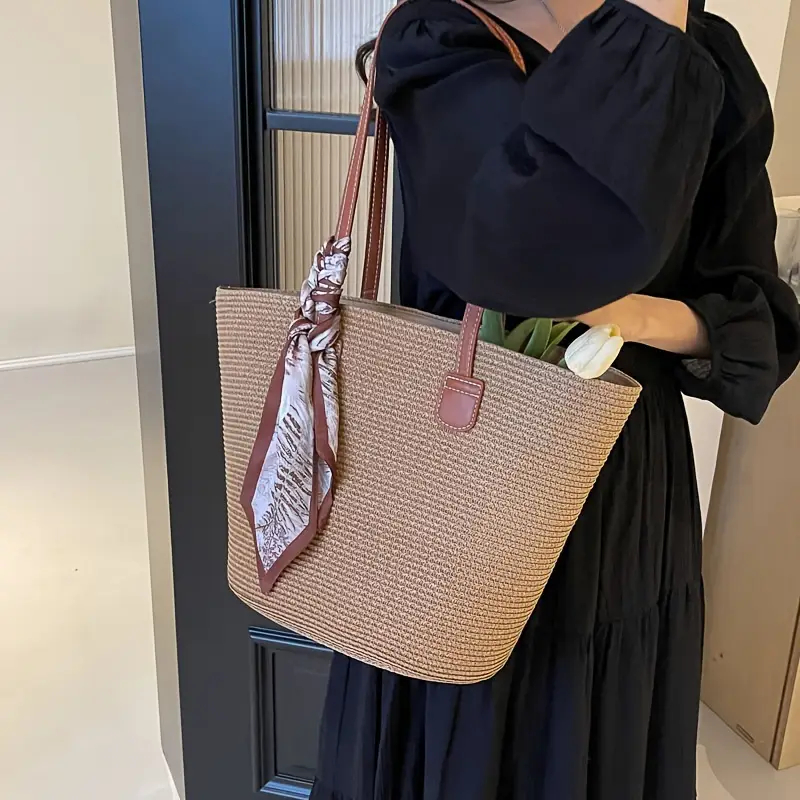 Bolsa Tote de Palha Francesa (com Guia de Limpeza e Cuidados) Esta bolsa tote de palha é o toque final perfeito para qualquer look de verão e uma escolha prática para o dia a dia. Feita de palha de alta qualidade, sua textura delicada exala um toque natural e uma vibe relaxante de férias na França. As dimensões da bolsa foram cuidadosamente pensadas: 45 cm de comprimento, 29 cm de altura e 23 cm de largura na base. Ela oferece amplo espaço, acomodando facilmente laptops, guarda-chuvas, cosméticos e outros itens essenciais do dia a dia. A alça de ombro de couro de 32 cm de comprimento é macia ao toque e oferece excelente suporte, tornando-a confortável e sem pressão para carregar no ombro. É versátil o suficiente para compras, deslocamentos diários ou férias na praia. Os conectores da alça em couro marrom contrastam com o corpo de palha, reforçando a conexão entre a alça de ombro e a bolsa, além de adicionar um toque de sofisticação e realçar o design geral. Esta bolsa possui um design simples, porém sofisticado, e seu tom marrom claro é versátil e combina com qualquer estilo. Pode ser usada com vestidos, looks com jeans, roupas casuais e muito mais, criando facilmente um visual moderno, retrô ou descontraído. Guia de Limpeza e Cuidados Método de Limpeza: Para sujeira leve do dia a dia, remova delicadamente a poeira da superfície com uma escova seca de cerdas macias. Para manchas localizadas, limpe suavemente com um pano macio umedecido com um pouco de água e deixe secar ao ar livre em local bem ventilado, evitando a luz solar direta. Não mergulhe a bolsa completamente em água, pois isso pode deformar e desbotar o material de palha. Dicas de Cuidado: Quando não estiver em uso, preencha a bolsa com jornal ou um suporte para bolsas para manter seu formato; Em seguida, coloque-a em um saco de tecido e guarde em local fresco e seco, evitando ambientes úmidos e com altas temperaturas para impedir que a palha mofe e fique quebradiça. A alça de ombro de couro pode ser limpa regularmente com um condicionador de couro para manter sua maciez e brilho; evite o contato com objetos pontiagudos para evitar arranhões. Seja para apreciar o pôr do sol na praia ou para explorar a selva de pedra da cidade, esta bolsa de palha, com seu estilo único e funcionalidade prática, se tornará uma companheira fiel no seu estilo e na sua vida, ajudando você a descobrir a beleza do cotidiano, onde natureza e moda se harmonizam perfeitamente. Observação: Este produto não inclui um lenço de seda!