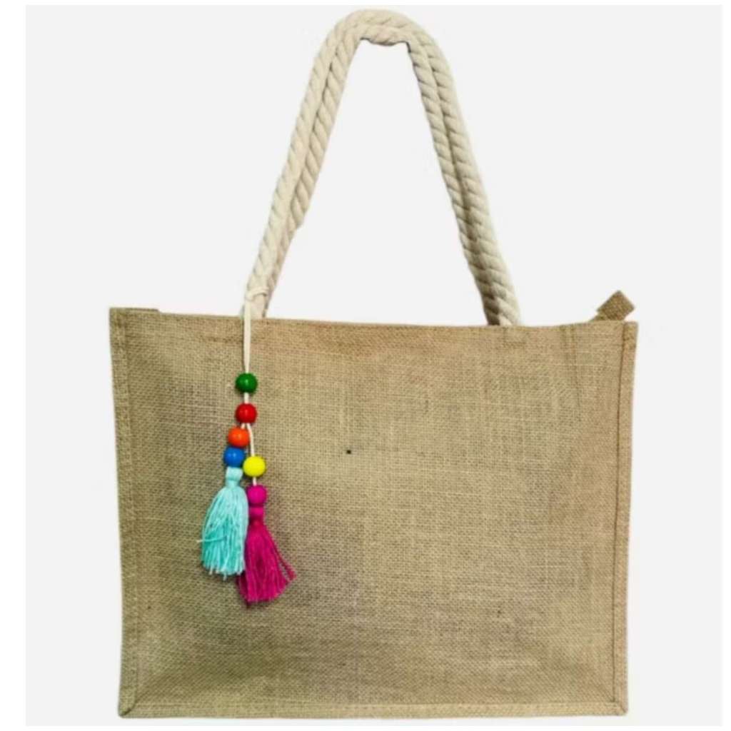 Bolsa de Praia Rústica Moda Praia Verão. Linda bolsa de praia, pode ser usada também para quem trabalha com personalização. Leve todos seus itens e acessórios para praia ou piscina em uma única bolsa. Possui alça de ombro e fechamento por zíper. Estilo sacola de juta. Ecobag. - Possui alça de ombro estilo corda trançada, confortável e resistente; - Fechamento principal de zíper; - Não possui forro interno; - Acompanha 1 pompom colorido; - Material rústico de juta. - Cor caramelo. Dimensões Aproximadas: - Altura: 33cm. - Comprimento: 41cm.