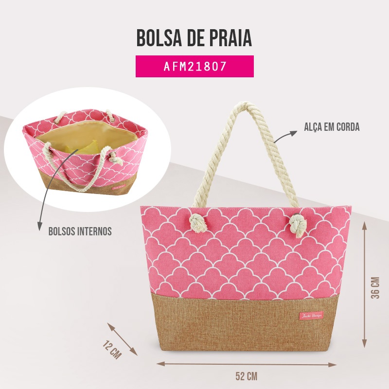 A Bolsa de Praia Jacki Design, possui fecho em zíper e amplo espaço interno. Feita de tecido de nylon, a alça em corda dá um charme especial. Esta bolsa é perfeita tanto para o dia a dia quanto para levar à praia ou piscina. Arrase em qualquer lugar! CUIDADOS GERAIS: Limpe a bolsa com um pano úmido. Caso necessário, use sabão neutro ou álcool para higienizar o local. Deixe secar na sombra. ATENÇÃO: Para preservar a vida útil do produto, recomendamos não deixar a bolsa de molho, não levar a máquina de lavar e também não utilizar produtos químicos.' Medidas: Comprimento: 52cmx Largura: 12cm x Altura: 36cm Material: Nylon POR QUE VOCÊ NÃO PODE DEIXAR DE COMPRAR NOSSO PRODUTO? Adquirindo diretamente conosco, você vai ter a certeza de estar comprando um produto original da marca Jacki Design. E isso é muito importante, para não se frustrar caso adquira um produto falsificado ou de péssima qualidade. Os produtos são de ótima qualidade, e com detalhes pensando em facilitar e organizar o seu dia-a-dia. Embalamos com todo cuidado e enviamos rapidamente pra você! E estaremos sempre a disposição para te atender da melhor forma possível. 3 meses de garantia