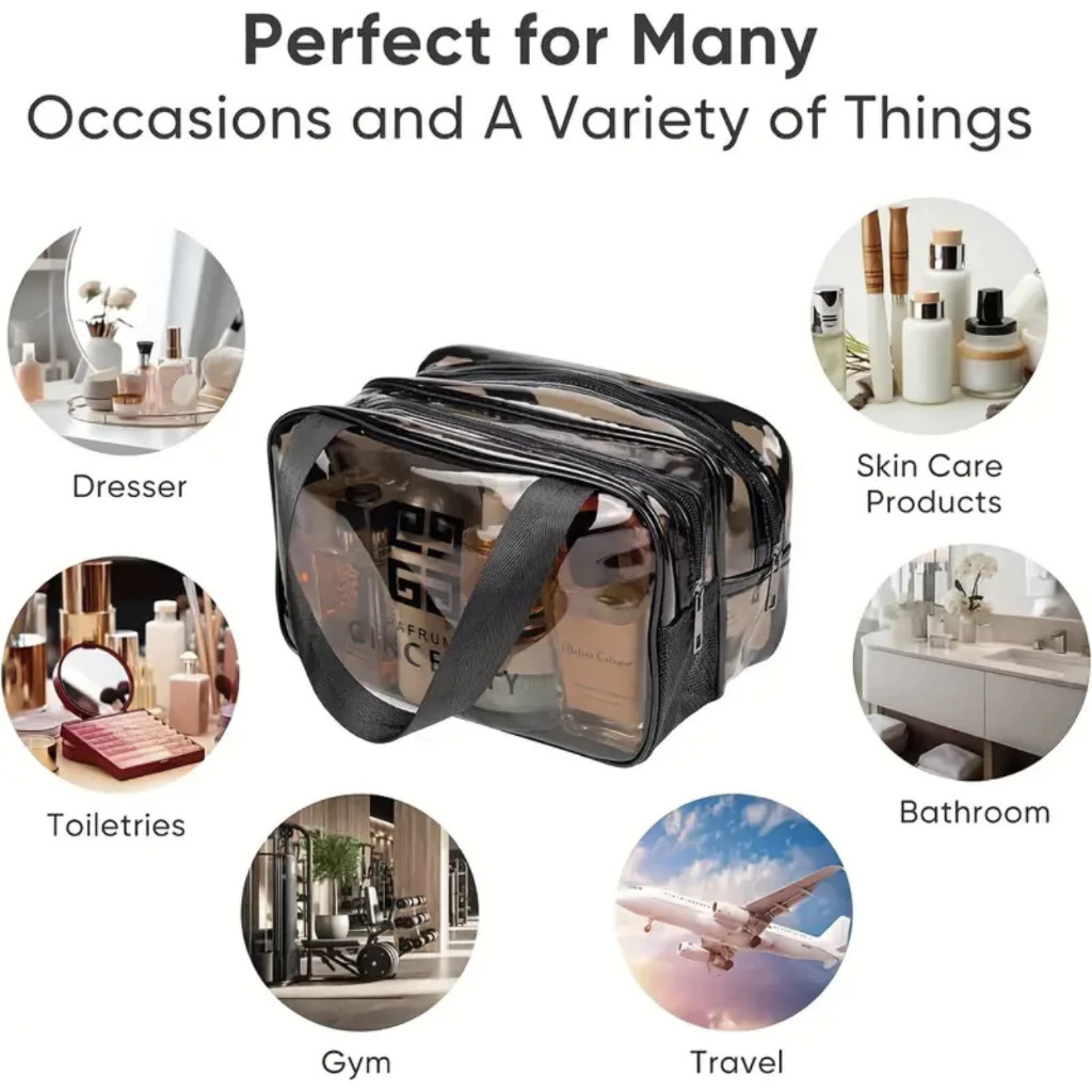 Bolsa Transparente para Organização de Higiene Pessoal Separação de itens secos e molhados | Grande capacidade | Compartimentos organizados Características do Produto Duas opções de tamanho: Médio: 28cm × 16cm × 17cm Grande: 32cm × 16cm × 21cm Atende diferentes necessidades, ideal para uso diário ou viagens. Design transparente e prático: Material transparente de alta qualidade que facilita a visualização do conteúdo, economizando tempo. Separação de itens secos e molhados: Projetada com compartimentos multifuncionais para armazenar produtos de cuidados pessoais, maquiagem e higiene, mantendo tudo organizado e limpo. Grande capacidade e funcionalidade: Com divisórias bem planejadas, pode acomodar diversos itens como cremes, shampoo, condicionador, sprays e outros produtos em frascos. Design portátil com alça de mão: Alça confortável e resistente, ideal para transporte diário ou viagens curtas, combinando estilo e praticidade. Cenários de Uso Organização diária: Perfeito para organizar pequenos itens em casa ou no escritório. Viagens: Essencial para armazenar produtos de higiene ou maquiagem durante viagens ou deslocamentos. Academia: Ideal para levar produtos de cuidado pessoal para o treino. Informações sobre o material PVC transparente: Impermeável, resistente a manchas e fácil de limpar. Alça de mão em tecido reforçado: Durável e de alta resistência. Torne sua organização diária mais prática e estilosa!