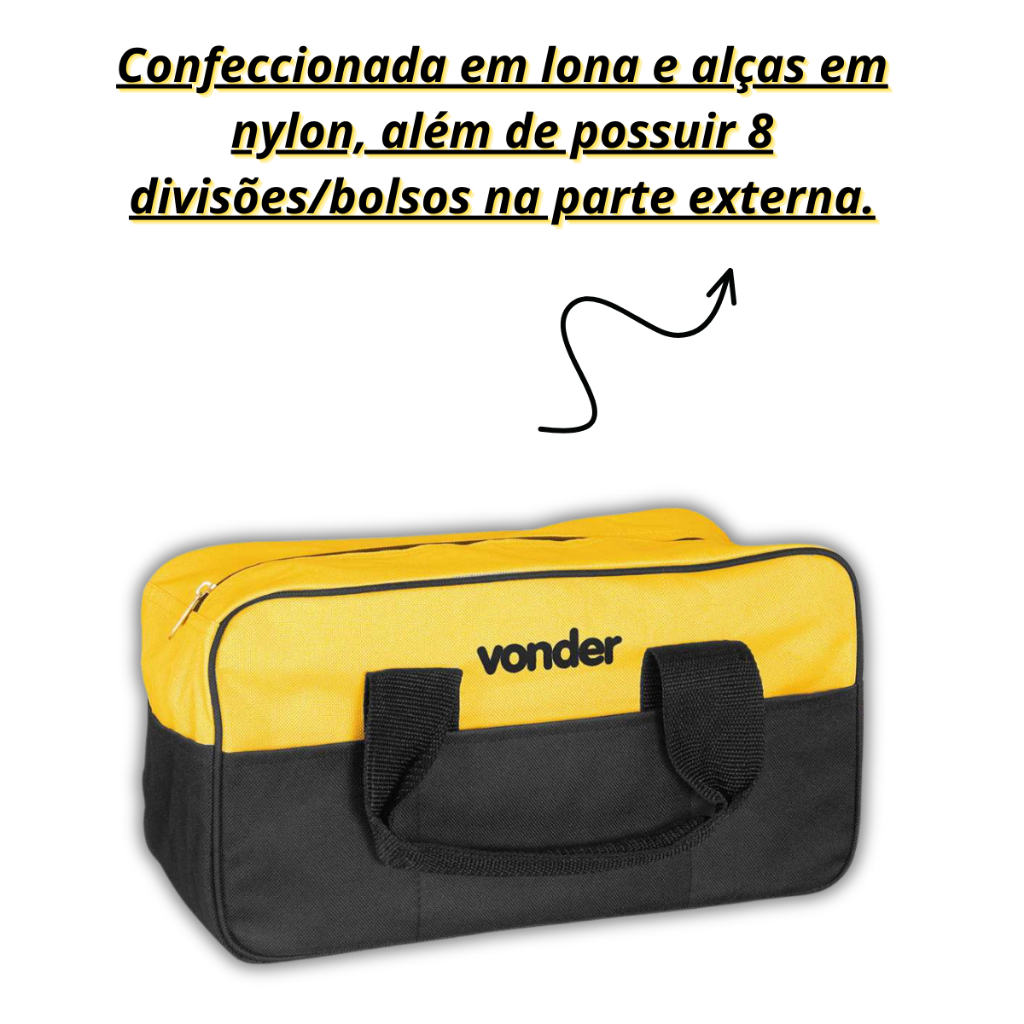 Bolsa em Lona para Ferramentas BL 005 – Vonder🧰🔥 Chega de ferramenta jogada e bagunça no carro, na obra ou em casa. A Bolsa em Lona Vonder BL 005 é perfeita pra quem quer carregar e organizar ferramentas e acessórios com mais praticidade no dia a dia. Feita em lona resistente com alças em nylon, ela aguenta o corre e ainda tem 8 bolsos externos que deixam tudo fácil de pegar, sem ficar procurando no fundo da bolsa. Ideal pra eletricista, instalador, mecânico, montador e uso doméstico também. Itens Inclusos: 📦 • 1 Bolsa em lona para ferramentas Vonder BL 005 Especificações Técnicas ⚙️ Modelo: BL 005 Material: Lona Alças: Nylon Quantidade de bolsos: 8 divisões/bolsos externos Capacidade máxima de carga: 5 kgf Medidas: • Comprimento: 350 mm • Largura: 125 mm • Altura: 180 mm Peso aproximado: 0,348 kg Garantia: 90 dias (legal) Por que escolher este produto? ⭐ Produto novo e original ✅ Pronta entrega e envio em até 24 horas 🚚💨 Compra 100% segura 🔒🛒✨