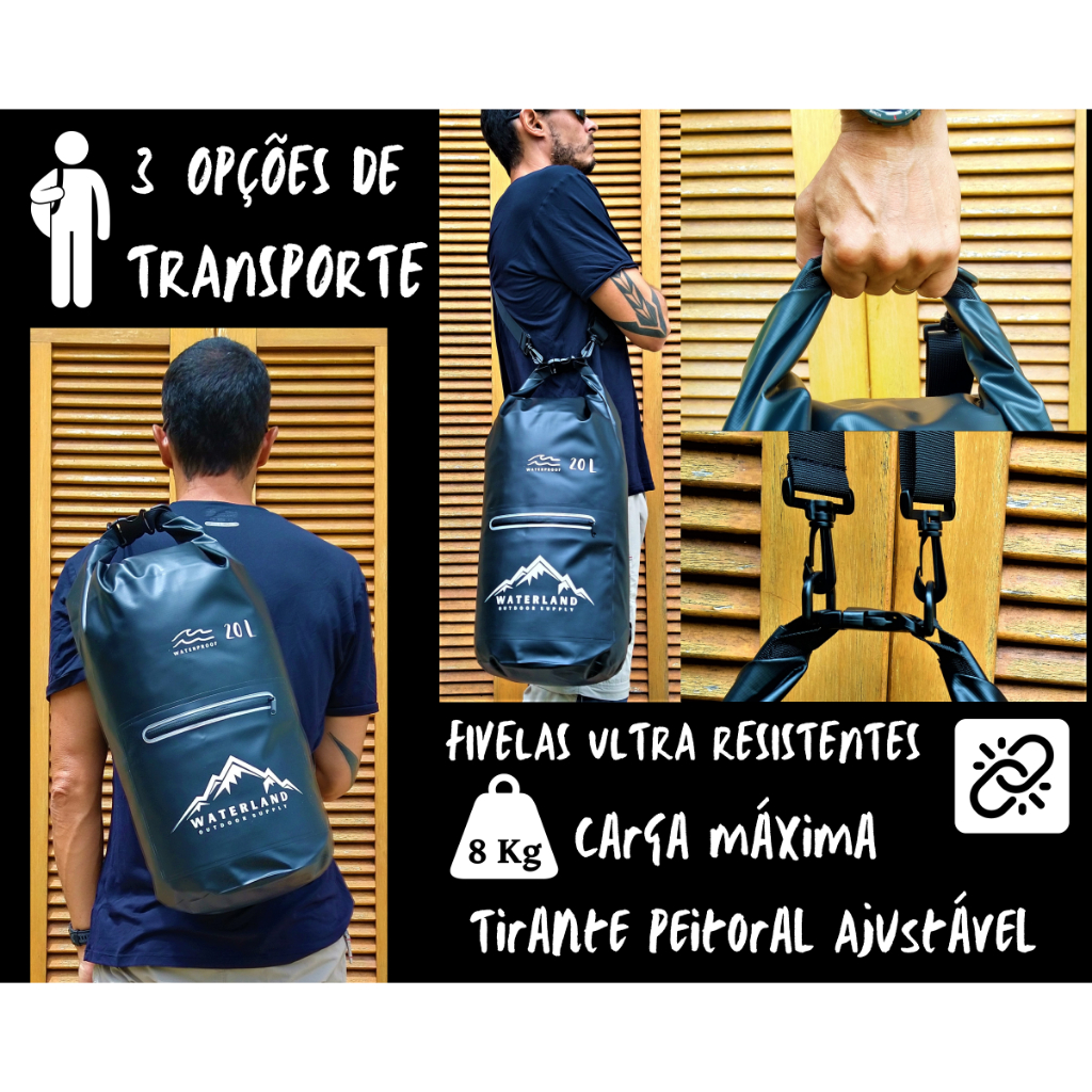 WATERLAND É MARCA REGISTRADA. REGISTRO DE PROPRIEDADE E USO EXCLUSIVO DA EMPRESA: TERRA FIRME IMPORTAÇÃO. BOLSA SACO ESTANQUE MOCHILA 20L COM ALÇA PARA TRANSPORTE E BOLSO EXTERNO COM TARJA REFLETIVA WATERLAND PRODUTO ORIGINAL COM NOTA FISCAL. A tarja refletiva é Recomendada em equipamentos de atividades ao ar livre pelo mundo todo. _______________________________________________________________________ EQUIPAMENTO QUE RESPEITA TODOS OS REQUISITOS DE QUALIDADE NECESSÁRIOS PARA A FINALIDADE A QUAL SE DESTINA. CARREGANDO SEUS OBJETOS NUMA BOLSA DE QUALIDADE, SUA EXPERIÊNCIA SÓ LHE TRARÁ LEMBRANÇAS POSITIVAS. _______________________________________________________________________ _____FINALIDADE Equipamento desenvolvido para prática de Atividades de Lazer na Água, Neve, Areia, Lama ou Barro. Mantém seus objetos e equipamentos Secos, Limpos e Protegidos durante Atividades ao Ar Livre. Também pode ser usado para Transportar Água. Obedecendo os limites de carga segundo o Manual. _____CAPACIDADE 20 Litros de Capacidade pra você levar Tudo que precisa. Suporta até 8 Kg de equipamentos. _____RESISTÊNCIA Material super resistente, vai superar suas expectativas. Construída em Lona de PVC, reforçada com Tecido de Trama de Poliéster, com propriedades Anti Rasgos (Rip Stop). Tirante Ajustável de Nylon Premium e Fivelas Ultra resistentes em Polipropileno de Alta Rigidez. _____IMPERMEABILIDADE Compartimento Principal 100% Impermeável! Pode ser exposta a Água, Neve, Areia, Lama ou Barro. Pode ser usada para transportar Água. _____SUBMERSÃO Pode ser 100% Submersa até 1,50m de profundidade em Curtos Períodos de tempo, como um Salto na Água ou a Travessia de um Rio por exemplo. Não foi desenvolvida para Submersão Prolongada. _____FLUTUABILIDADE Se fechada corretamente seguindo instruções contidas no Manual, pode-se manter quantidade interna de ar, suficiente para mantê-la flutuando em caso de quedas na água. _____TRANSPORTE 3 opções para transporte: Mochila: Usando-se o tirante no Peitoral com uma extremidade conectada no olhal inferior, e outra conectada no olhal de uma das alças. Bolsa a Tiracolo: Usando-se as 2 extremidades do tirante, conectadas nos respectivos olhais das alças. Sacola: Usando a alça formada pelo sistema de estanqueidade quando conectadas, sem uso do Tirante. _____EXCLUSIVO BOLSO EXTERNO COM FAIXA REFLETIVA Exclusivo e Diferenciado, o Bolso Externo mede 24,00 x 18,00cm. Para guardar e permitir Acesso Rápido a objetos que precisam ser usados com maior frequência durante uma atividade como celular, máquina fotográfica e etc. O BOLSO NÃO FOI DESENVOLVIDO PARA PROTEGER OS OBJETOS DURANTE IMERSÃO TOTAL DA MOCHILA NA ÁGUA OU EXPOSIÇÃO INTENSA A ÁGUA. _____FABRICAÇÃO Fabricada com avançado sistema de Solda Térmica, sem uso de linhas e costuras na união das partes da mochila para garantir total impermeabilidade. Através do calor ideal, as partes são fundidas entre si, formando praticamente uma peça única. Oferecendo resistência e impermeabilidade muito superiores, comparada com sistema de costura tradicional. _____OUTRAS UTILIDADES Pode ser usado pra transportar objetos molhados e úmidos como roupa se Surf, toalhas ou roupas molhadas após uma atividade. Quando não usado pode ser enrolado e guardado, ocupando pouco espaço. Fácil de lavar e secar, caso necessário. Pode ser usada para transportar água. Obedecendo os limites de carga segundo o Manual.