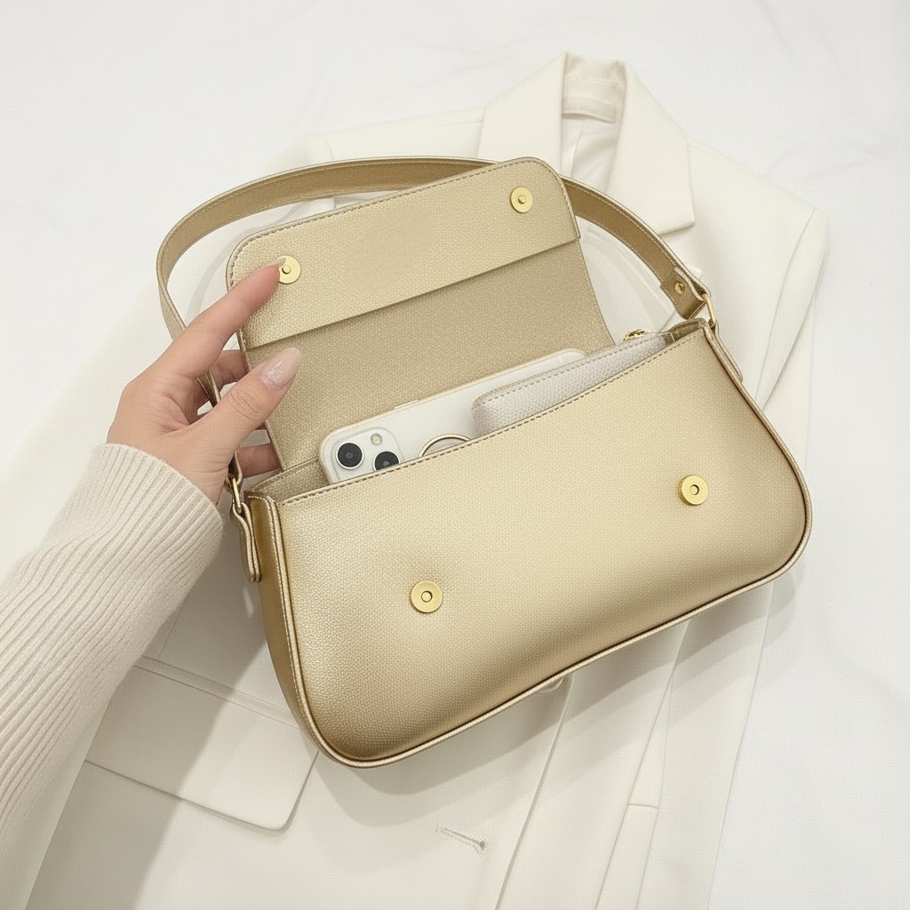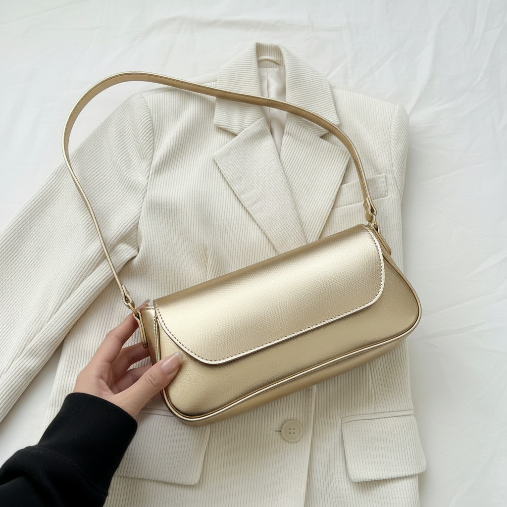 Bolsa Feminina Baguete Dourada Ouro Alça De Ombro Fina Estilosa E Casual