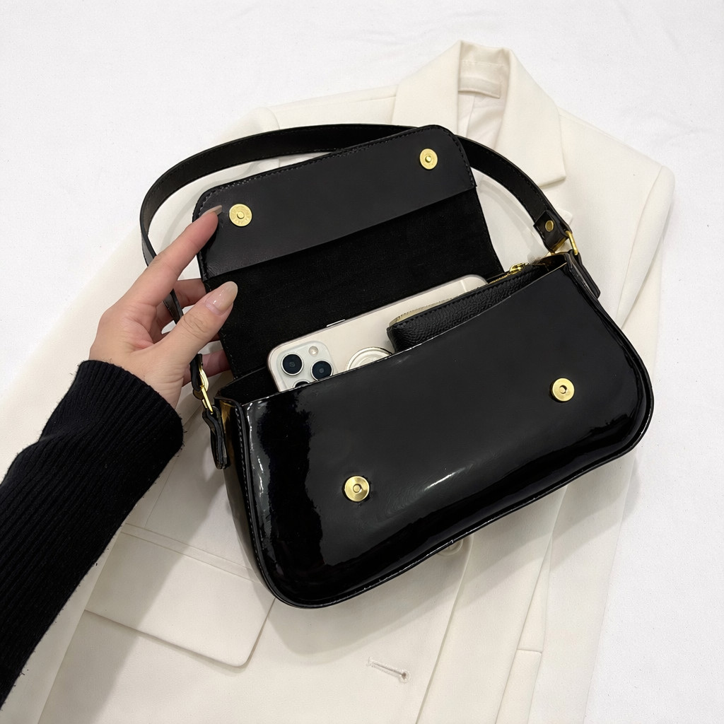 Bolsa Feminina Baguete Verniz Preto Alça De Ombro Fina Estilosa E Casual